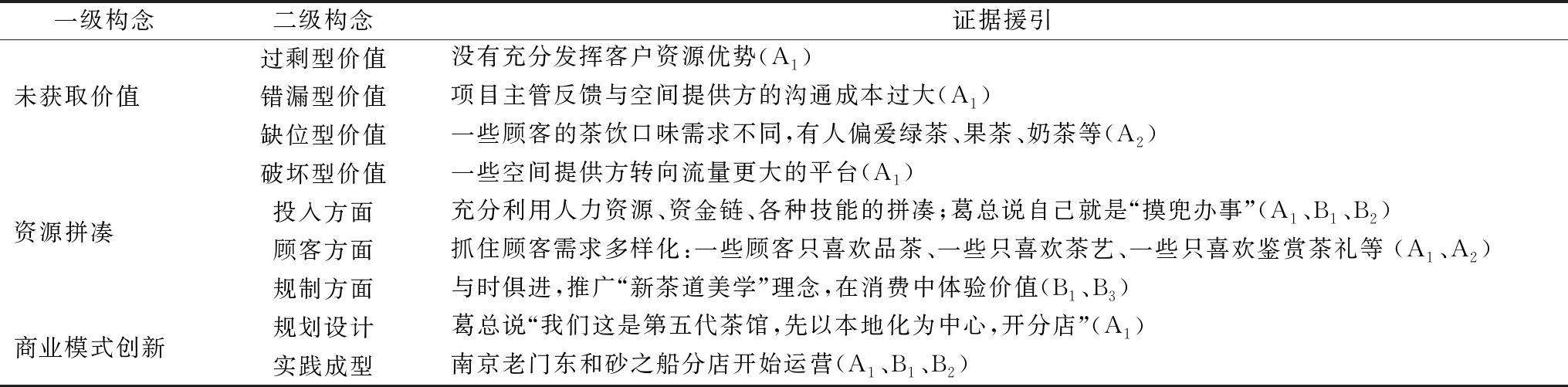 一级构念二级构念证据援引过剩型价值没有充分发挥客户资源优势(A1)未获取价值错漏型价值项目主管反馈与空间提供方的沟通成本过大(A1)缺位型价值一些顾客的茶饮口味需求不同,有人偏爱绿茶、果茶、奶茶等(A2)破坏型价值一些空间提供方转向流量更大的平台(A1)资源拼凑投入方面充分利用人力资源、资金链、各种技能的拼凑;葛总说自己就是“摸兜办事”(A1、B1、B2)顾客方面抓住顾客需求多样化:一些顾客只喜欢品茶、一些只喜欢茶艺、一些只喜欢鉴赏茶礼等 (A1、A2)规制方面与时俱进,推广“新茶道美学”理念,在消费中体验价值(B1、B3)商业模式创新规划设计葛总说“我们这是第五代茶馆,先以本地化为中心,开分店”(A1)实践成型南京老门东和砂之船分店开始运营(A1、B1、B2)