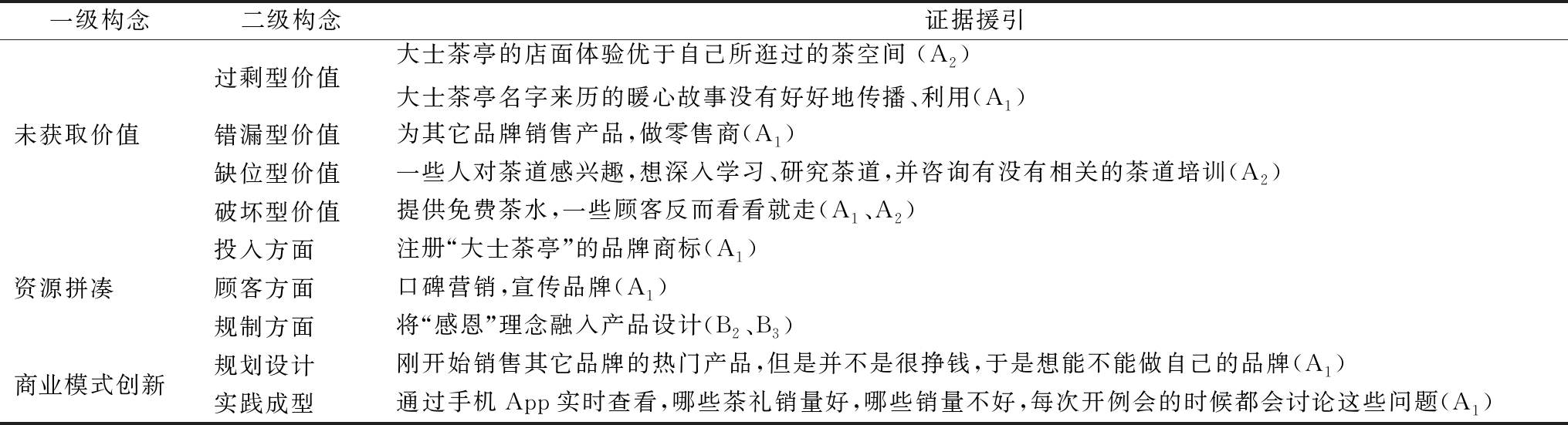 为了保证理论饱和度,本文做了3件事:①针对商业模式创新、资源拼凑和未获取价值3个核心概念,在理论述评环节充分理解各概念分析维度;②充分掌握大士茶亭企业资料,对多种渠道来源资料进行相互验证和分析;③和企业一把手充分沟通,促进理论上的饱和。