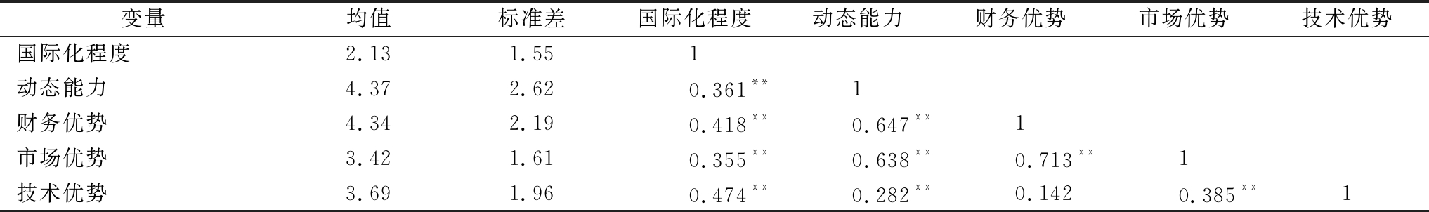 描述性统计和相关性分析结果见表2。从中可见,企业国际化程度、动态能力与竞争优势3个维度间在0.01水平上呈现相关关系,但相关程度不一。