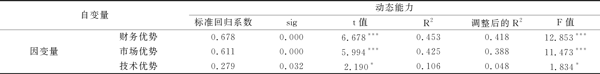 自变量动态能力标准回归系数sigt值R2调整后的R2F值财务优势0.6780.0006.678***0.4530.41812.853***因变量市场优势0.6110.0005.994***0.4250.38811.473***技术优势0.2790.0322.190*0.1060.0481.834*