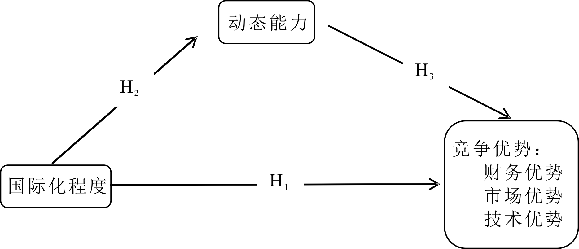并且,鉴于前文对国际化程度、动态能力、竞争优势关系3个变量的研究,本研究认为动态能力在国际化程度与竞争优势关系间具有中介效应。