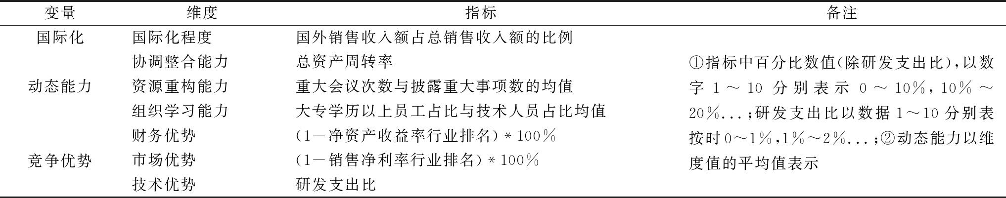 变量维度指标备注国际化国际化程度国外销售收入额占总销售收入额的比例①指标中百分比数值(除研发支出比),以数字1~10分别表示0~10%,10%~20%...;研发支出比以数据1~10分别表按时0~1%,1%~2%...;②动态能力以维度值的平均值表示协调整合能力总资产周转率动态能力资源重构能力重大会议次数与披露重大事项数的均值组织学习能力大专学历以上员工占比与技术人员占比均值竞争优势财务优势(1-净资产收益率行业排名)*100%市场优势(1-销售净利率行业排名)*100%技术优势研发支出比