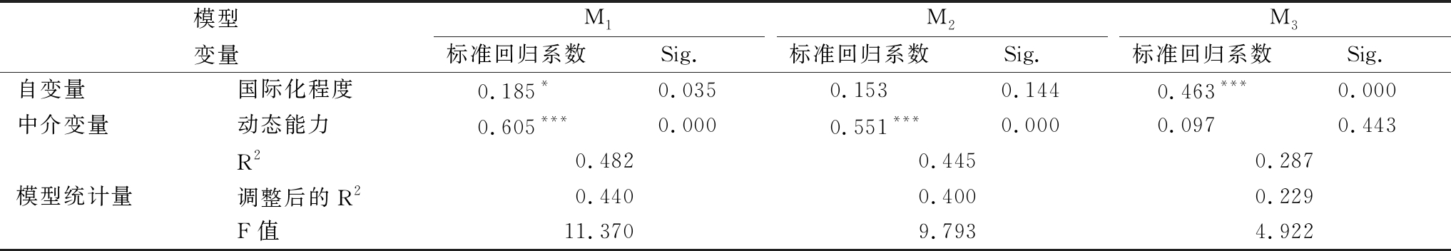 模型变量M1标准回归系数Sig.M2标准回归系数Sig.M3标准回归系数Sig.自变量国际化程度0.185*0.0350.1530.1440.463***0.000中介变量动态能力0.605***0.0000.551***0.0000.0970.443R20.4820.4450.287模型统计量调整后的R20.4400.4000.229F值11.3709.7934.922