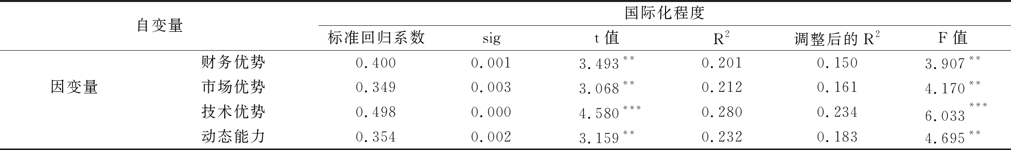 自变量国际化程度标准回归系数sigt值R2调整后的R2F值财务优势0.4000.0013.493**0.2010.1503.907**因变量市场优势0.3490.0033.068**0.2120.1614.170**技术优势0.4980.0004.580***0.2800.2346.033***动态能力0.3540.0023.159**0.2320.1834.695**
