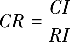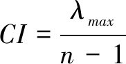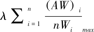 (2)判断矩阵一致性检验。判断矩阵一致性指标CI与同阶平均随机一致性指标RI(其取值以Saaty教授提出的RI关于n的分布表为依据)之比称为随机一致性比率CR。当CR=CI/RI<0.10时,可以认为判断矩阵的一致性较好。其中λmax为判断矩阵的最大特征根,n为判断矩阵中的指标个数。
