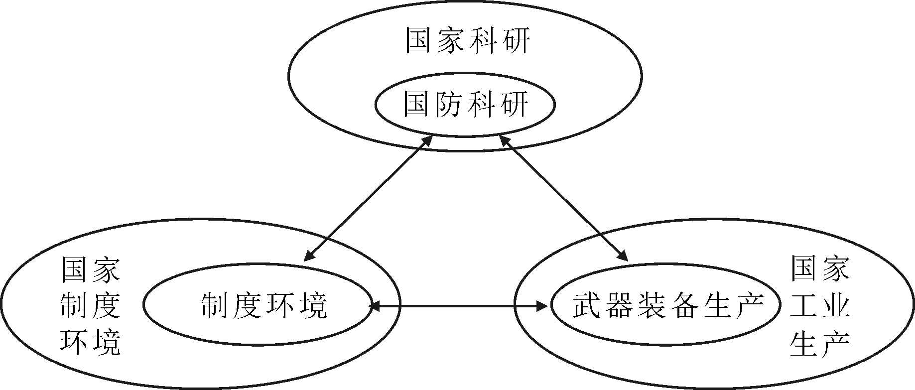 国防科技工业体系最基本、最重要的功能是生产武器装备。武器装备寿命周期一般分为论证、方案、研制、生产、部署使用及退役6个阶段[4]。认证、方案和研制属于国防科技研发范畴,生产属于武器装备批量制造阶段,这些都是在国防科技工业领域完成的,部署、使用、退役则在军队系统中完成。因此,可根据国防科技工业体系在武器装备寿命周期各阶段的作用,将其分为国防科技研发和武器装备生产两大子系统。国防科技研发子系统是一个国家科研系统的重要组成部分,武器装备生产子系统也不可能独立于一个国家的工业生产系统而存在。此外,任何系统运行都是在一定制度环境中,国防科技工业体系也不例外,因此政策、制度环境也是重要的子系统。同样,国防科技工业系统运行既需要针对该领域的政策制度支持,也会受到一国整体制度大环境制约和影响。鉴于此,可以认为国防科技工业体系实质是由分别嵌入到“国家科研系统—工业生产系统—制度环境”体系之中的“国防科研—武器装备生产—制度环境”三大核心要素相互耦合而成的共生系统,如图1所示。