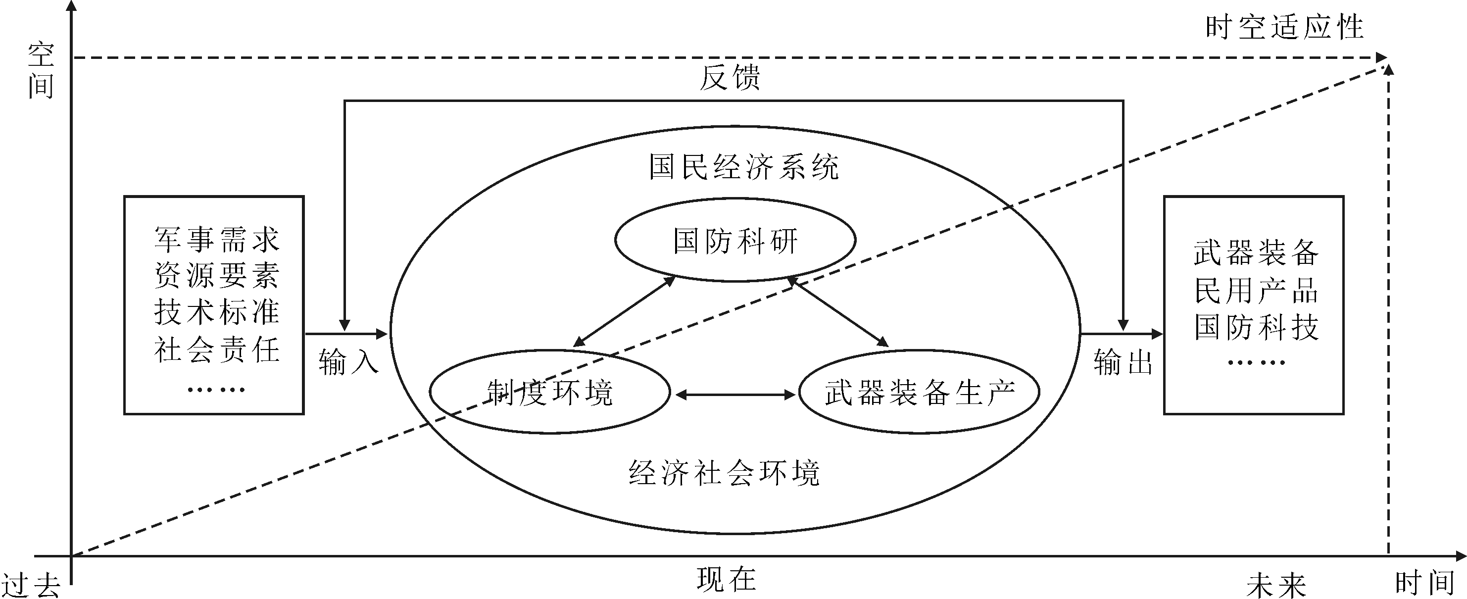 根据系统论原理,任何系统都会随时空发展而变化。国防科技工业体系是由3个子系统相互作用、相互关联而形成的整体。该系统中有些子系的运行过程并不清楚,类似于控制论中的黑箱,但可以通过输入与输出进行考察、控制[6]。从控制论角度,在给定的时间点,国防科技工业体系在国家安全发展利益拓展、军事需求牵引下,消耗资金、技术、人才等资源要素,在国家政策、法律和体制形成的运行环境中,经过科研主体和生产主体的“黑箱”式运作,对外展现出特定的空间布局、产业结构、产业组织等结构特征,输出武器装备、国防科技和民用产品,并在时间和空间维度上动态发展。当然,系统外部环境干扰及内部扰动均会对系统造成影响,可能导致系统运作偏离原定目标,此时就需要施加系统反馈控制[7]。“输出”结果会以信息的形式反馈到“输入”端,与需求进行匹配,使子系统运行满足条件并逐步最优化,同时优化下一轮投入产出过程,构成一种循环关系。这种循环关系会在时间和空间两个维度不断发展:在空间维度上扩张与缩小体现为国防科技工业体系的规模、结构、布局变迁;在时间维度上延伸体现出体系的动态性——进步或倒退。由于系统在时间上的推进和空间上的转移是共轭同生的,所以国防科技工业体系必然在时间变量和空间变量共同作用下呈现出整体属性,其时空共轭关系如图3所示。