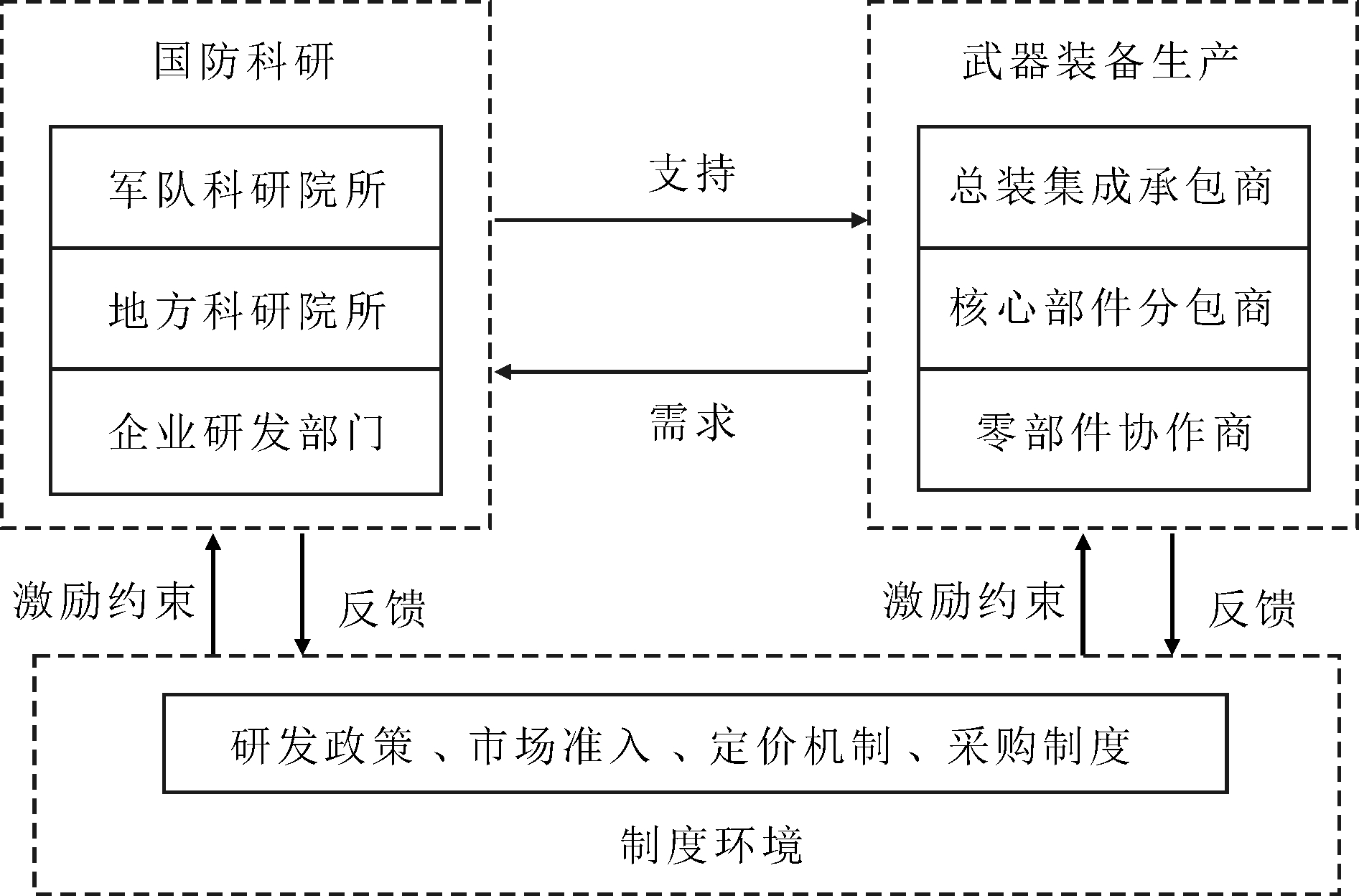 (3)制度环境子系统对科研生产子系统的激励、约束作用不足。首先,国防科技工业市场准入政策壁垒严重,极大抑制了产业竞争活力。进入军工市场需要获取军方装备采办部门和国防科技工业局要求的资质认证,即“军工三证”。虽然国家出台了一系列鼓励和支持民营企业进入军工市场的政策,但依然困难重重,“弹簧门”和“旋转门”现象仍未消除。复杂的认证、材料审批流程和严格的限制条件,极大提高了民营企业进入国防工业领域的交易成本,构筑起有形和无形的军工市场进入壁垒,降低了民营企业参军的积极性,进而影响军工市场竞争的公平性;其次,成本加成的军品定价机制无法形成降低成本的创新压力。在成本不构成约束的情况下,军工集团回避竞争机制,倾向于将生产全过程配置在集团内部,形成“肥水不流外人田”的封闭体系,虽然能避免激烈的成本竞争压力,但资源配置效率低下,导致 “拖、降、涨”问题长期得不到有效解决;最后,军工企业并不是真正意义上的独立市场经济主体,预算软约束问题突出。军工集团都是由原来的政府部门经历数次改革而成,并不是根据市场需要自发演变的结果,生产什么、生产多少武器装备受国家行政计划影响,与完全根据利润最大化目标选择投资方向和产品的企业不同,这就决定了中国军工集团必然要承担一定的“战略性政策负担”。只要企业负有着政策性负担,就会引发企业预算软约束问题,就必然需要政府补贴[13]。
