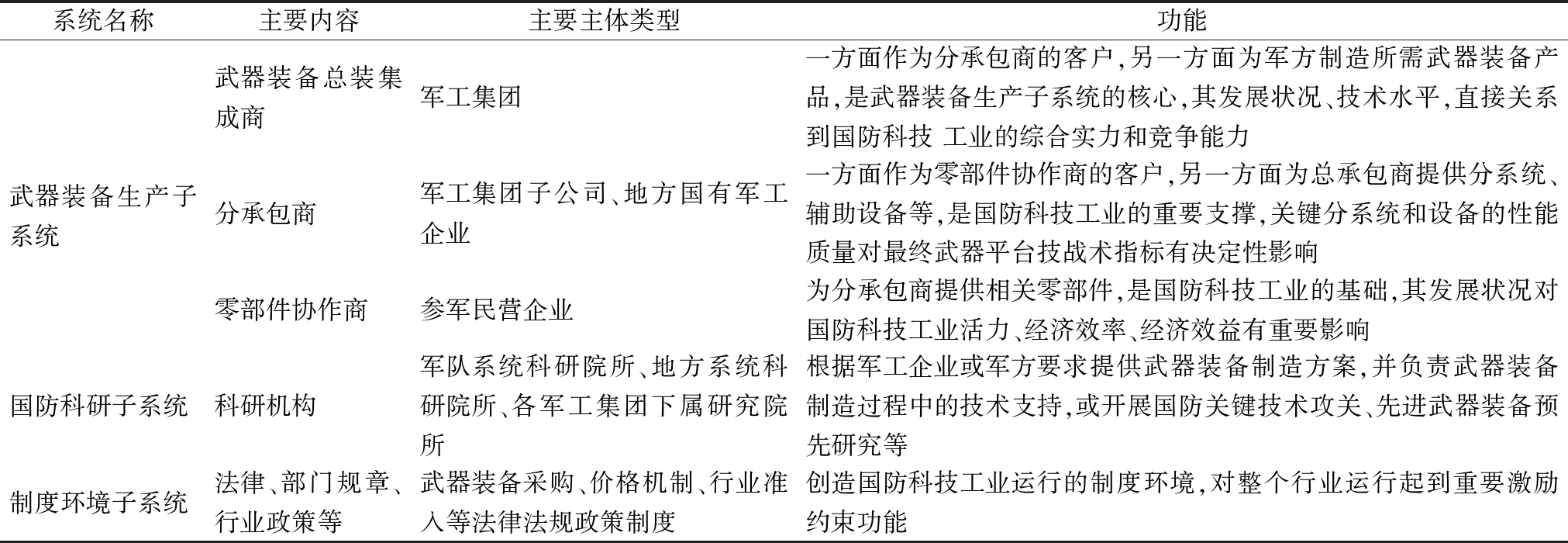 表1 国防科技工业体系各子系统组成要素及功能比较