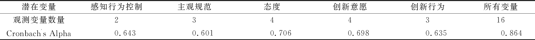 潜在变量感知行为控制主观规范态度创新意愿创新行为所有变量观测变量数量2344316Cronbach's Alpha0.6430.6010.7060.6980.6350.864