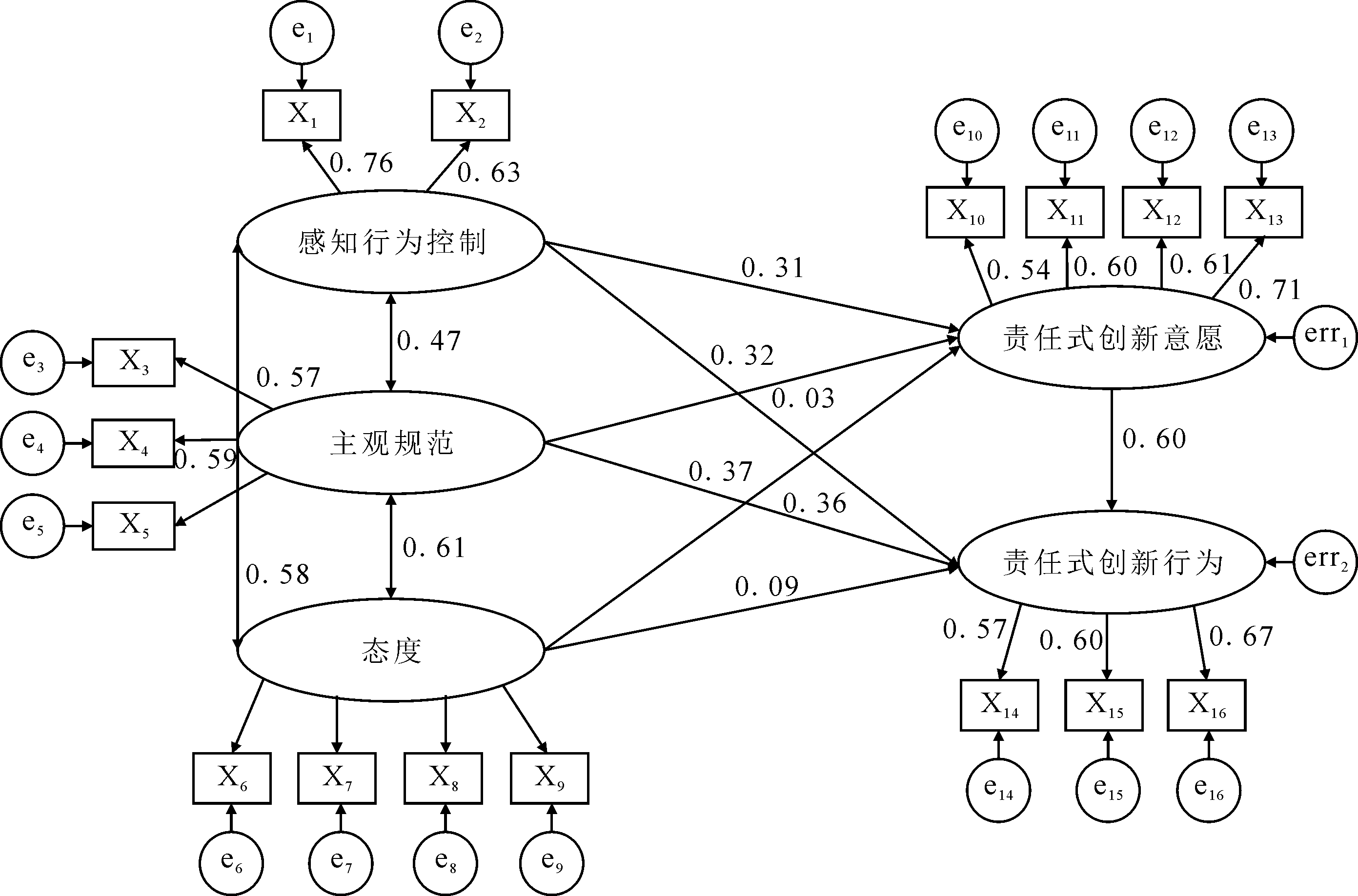 图2体现了模型各参数变量间的路径系数关系。其中,X1~X9表示员工感知行为控制、主观规范和行为态度的观察变量;X10~X16分别表示员工责任式创新意愿和责任式创新行为的观测变量;e1~e16表示各观察变量的残差;err1~err2分别表示责任式创新意愿和责任式创新行为的测量偏差。变量路径系数计算结果见表4,通过建立并分析模型,对本研究所提假设进行检验。