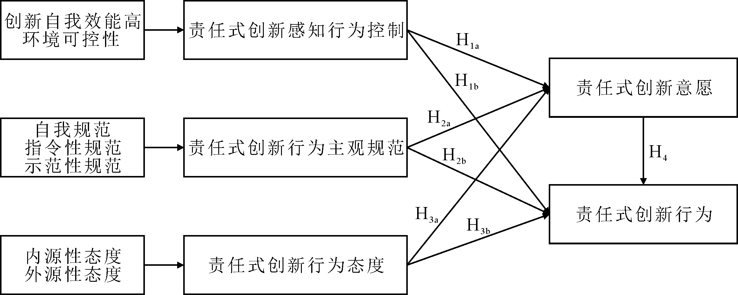 示范性规范主要关注员工对他人态度及行为的感知,作为新型研发机构的一份子,员工责任式创新行为必然受周围人的影响,尤其是管理者、同事及同行业竞争者。一方面,新型研发机构管理者责任式创新理念指引员工开展责任式创新活动,身边同事进行责任式创新的实践会潜在催生其他员工实施责任式创新行为的意愿。因此,员工会在考虑周边人际环境的前提下决定是否实施责任式创新行为,这将对员工责任式创新意愿及行为产生导向作用,激励其采取责任式创新行为;另一方面,员工责任式创新意愿受同行业竞争者行为的影响,当竞争者提高其责任式创新意识时,其研发产品也日益凸显社会责任的要求,并广泛被社会大众接受,这在一定程度上会激发员工的责任式创新意愿,进而将其意愿转化为行为。指令性规范主要是指来自组织及政府等的期望压力。员工在进行责任式创新行为过程中会感知到来自机构制度及政府政策的压力。政府关于推动责任式创新及可持续发展的政策要求对员工责任式创新行为形成了强有力的社会舆论监督和社会责任约束。此外,新型研发机构以推动技术产业化为发展目标,以当地政府政策为目标导向,必然将责任式创新体现在其管理制度体系中,要求员工进行责任式创新,进而实现机构发展目标。员工将来自机构和政府的期望压力转化为其进行责任式创新的意愿和行为。与此同时,责任式创新行为属于员工个体行为,是员工的自我规范。只有员工认为自己是机构的一员且有责任式创新意识,并认为进行责任式创新活动是自己应尽的责任和义务时,才有助于员工创新意愿及行为的产生。基于以上分析,本研究提出如下假设: