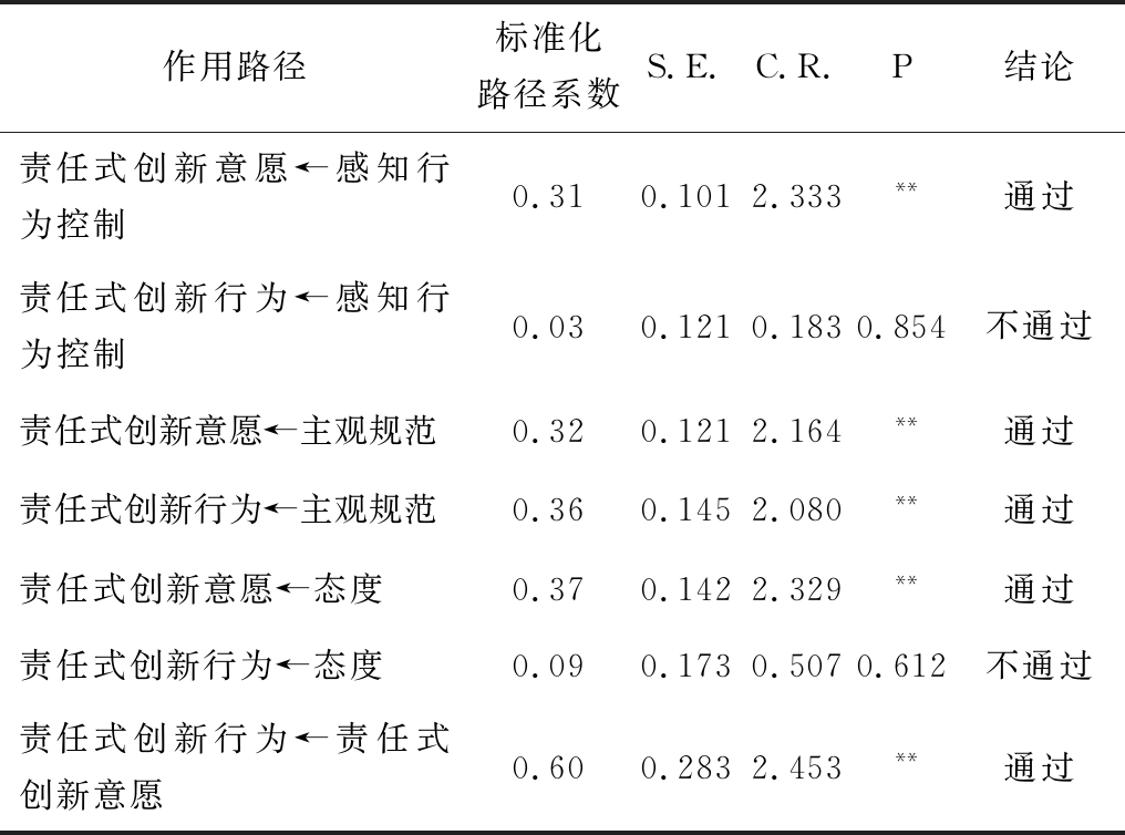 作用路径标准化路径系数S.E.C.R.P结论责任式创新意愿←感知行为控制0.310.1012.333**通过责任式创新行为←感知行为控制0.030.1210.1830.854不通过责任式创新意愿←主观规范0.320.1212.164**通过责任式创新行为←主观规范0.360.1452.080**通过责任式创新意愿←态度0.370.1422.329**通过责任式创新行为←态度0.090.1730.5070.612不通过责任式创新行为←责任式创新意愿0.600.2832.453**通过