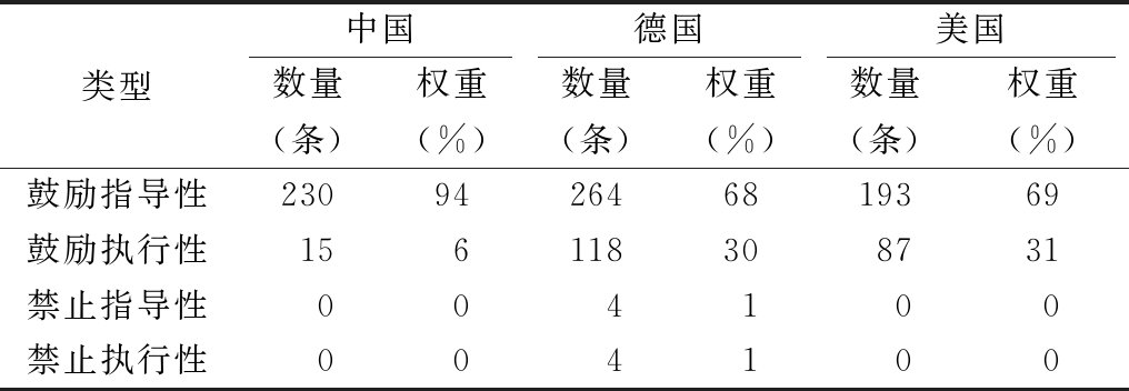 类型中国德国美国数量(条)权重(%)数量(条)权重(%)数量(条)权重(%)鼓励指导性230942646819369鼓励执行性156118308731禁止指导性004100禁止执行性004100