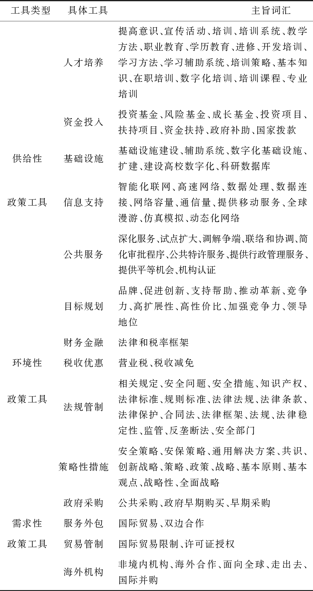 工具类型具体工具主旨词汇人才培养提高意识、宣传活动、培训、培训系统、教学方法、职业教育、学历教育、进修、开发培训、学习方法、学习辅助系统、培训策略、基本知识、在职培训、数字化培训、培训课程、专业培训资金投入投资基金、风险基金、成长基金、投资项目、扶持项目、资金扶持、政府补助、国家拨款供给性基础设施基础设施建设、辅助系统、数字化基础设施、扩建、建设高校数字化、科研数据库政策工具信息支持智能化联网、高速网络、数据处理、数据连接、网络容量、通信量、提供移动服务、全球漫游、仿真模拟、动态化网络公共服务深化服务、试点扩大、调解争端、联络和协调、简化审批程序、公共特许服务、提供行政管理服务、提供平等机会、机构认证目标规划品牌、促进创新、支持帮助、推动革新、竞争力、高扩展性、高性价比、加强竞争力、领导地位财务金融法律和税率框架环境性税收优惠营业税、税收减免政策工具法规管制相关规定、安全问题、安全措施、知识产权、法律标准、规则标准、法律法规、法律条款、法律保护、合同法、法律框架、法规、法律稳定性、监管、反垄断法、安全部门策略性措施安全策略、安保策略、通用解决方案、共识、创新战略、策略、政策、战略、基本原则、基本观点、战略性、全面战略政府采购公共采购、政府早期购买、早期采购需求性服务外包国际贸易、双边合作政策工具贸易管制国际贸易限制、许可证授权海外机构非境内机构、海外合作、面向全球、走出去、国际并购