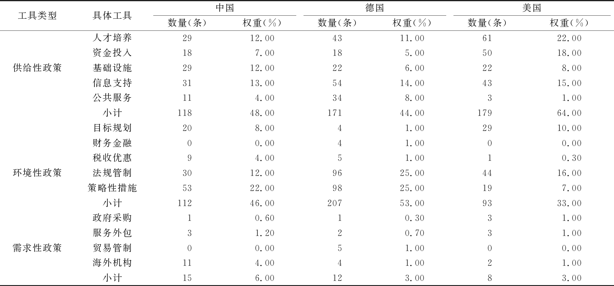 工具类型具体工具中国德国美国数量(条)权重(%)数量(条)权重(%)数量(条)权重(%)人才培养2912.004311.006122.00资金投入187.00185.005018.00供给性政策基础设施2912.00226.00228.00信息支持3113.005414.004315.00公共服务114.00348.0031.00小计11848.0017144.0017964.00目标规划208.0041.002910.00财务金融00.0041.0000.00税收优惠94.0051.0010.30环境性政策法规管制3012.009625.004416.00策略性措施5322.009825.00197.00小计11246.0020753.009333.00政府采购10.6010.3031.00服务外包31.2020.7031.00需求性政策贸易管制00.0051.0000.00海外机构114.0041.0021.00小计156.00123.0083.00