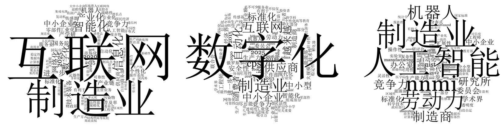 运用QSR Nvivo(版本号:10.0.573.0 sp5(64位))软件,按照条款进行归类编码,并剔除无效条款进行词语云对比,分析中国、德国、美国“互联网+制造”模式下的政策重点(见图3)。通过词语云分析得出的政策特点如下:①中国“互联网+制造”模式下的政策是通过互联网的拉动,实现制造业工业化与数字化快速融合以及制造业高端化和智能化;②德国制造业全球领先,德国“互联网+制造”政策以数字化为核心推动工业4.0实施,实现整个制造体系跃迁式发展,成为新一代智能制造技术的使用方和受益方,同时也成为先进制造技术的创造方和供给方;③美国“互联网+制造”政策通过制造业智能设备、智能系统的人工智能发展,推进工业互联网在整个工业经济中发挥作用,以提高生产率、降低成本、减少浪费,促进制造业与大数据融合,实现智能服务。总之,尽管侧重点不同,但3个国家在“互联网+制造”政策方面本质上相同,即通过信息流与实物流的无缝对接,提高实物流节点耦合性,实现系统、结构、功能、行为的统一。