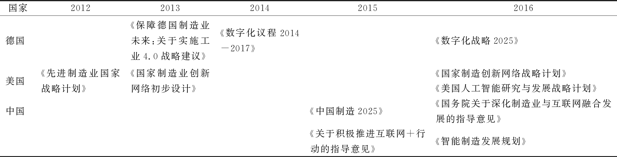 国家20122013201420152016德国《保障德国制造业未来:关于实施工业4.0战略建议》《数字化议程2014-2017》《数字化战略2025》美国《先进制造业国家战略计划》《国家制造业创新网络初步设计》《国家制造创新网络战略计划》《美国人工智能研究与发展战略计划》中国《中国制造2025》《国务院关于深化制造业与互联网融合发展的指导意见》《关于积极推进互联网+行动的指导意见》《智能制造发展规划》