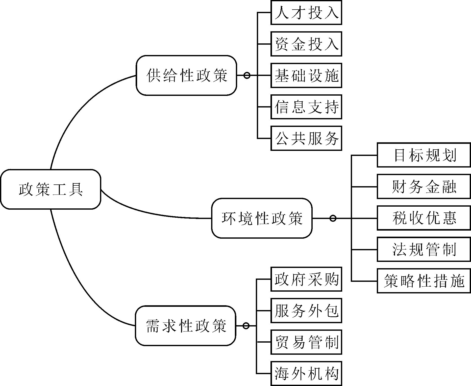 Rothwell和Zegveld的每类政策工具又可进一步划分为多种操作性层面的具体工具。其中,供给性政策工具包括人才培养、信息支持、技术支持、资金支持、公共服务;环境性政策工具包括财务金融、税收优惠、法规管制、策略性措施;需求性政策工具包括政府采购、服务外包、贸易管制、海外机构(盛亚等,2008),该政策工具在研究中得到了广泛应用,具体如图2所示。