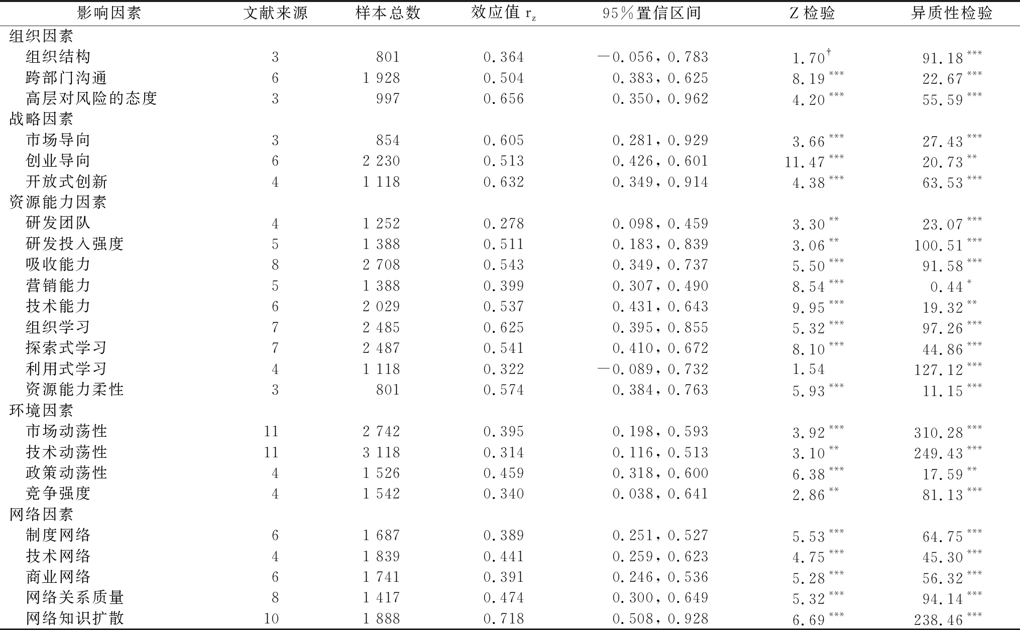 影响因素文献来源样本总数效应值rz95%置信区间Z检验异质性检验组织因素 组织结构38010.364-0.056, 0.7831.70†91.18*** 跨部门沟通61 9280.5040.383, 0.6258.19***22.67*** 高层对风险的态度39970.6560.350, 0.9624.20***55.59***战略因素 市场导向38540.6050.281, 0.9293.66***27.43*** 创业导向62 2300.5130.426, 0.60111.47***20.73** 开放式创新41 1180.6320.349, 0.9144.38***63.53***资源能力因素 研发团队41 2520.2780.098, 0.4593.30**23.07*** 研发投入强度51 3880.5110.183, 0.8393.06**100.51*** 吸收能力82 7080.5430.349, 0.7375.50***91.58*** 营销能力51 3880.3990.307, 0.4908.54***0.44* 技术能力62 0290.5370.431, 0.6439.95***19.32** 组织学习72 4850.6250.395, 0.8555.32***97.26*** 探索式学习72 4870.5410.410, 0.6728.10***44.86*** 利用式学习41 1180.322-0.089, 0.7321.54127.12*** 资源能力柔性38010.5740.384, 0.7635.93***11.15***环境因素 市场动荡性112 7420.3950.198, 0.5933.92***310.28*** 技术动荡性113 1180.3140.116, 0.5133.10**249.43*** 政策动荡性41 5260.4590.318, 0.6006.38***17.59** 竞争强度41 5420.3400.038, 0.6412.86**81.13***网络因素 制度网络61 6870.3890.251, 0.5275.53***64.75*** 技术网络41 8390.4410.259, 0.6234.75***45.30*** 商业网络61 7410.3910.246, 0.5365.28***56.32*** 网络关系质量81 4170.4740.300, 0.6495.32***94.14*** 网络知识扩散101 8880.7180.508, 0.9286.69***238.46***