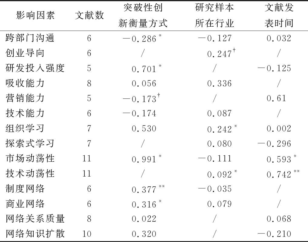 影响因素文献数突破性创新衡量方式研究样本所在行业文献发表时间跨部门沟通6-0.286*-0.1270.032创业导向6/0.247†/研发投入强度50.701*/-0.125吸收能力80.0560.336/营销能力5-0.173†/0.61技术能力6-0.1740.087/组织学习70.5300.242*0.002探索式学习7/0.080-0.296市场动荡性110.991*-0.1110.593*技术动荡性11/0.092*0.742**制度网络60.377**-0.035/商业网络60.316*0.079/网络关系质量80.022/0.068网络知识扩散100.320/-0.210