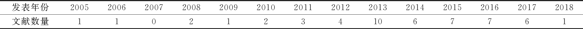 发表年份20052006200720082009201020112012201320142015201620172018文献数量110212341067761
