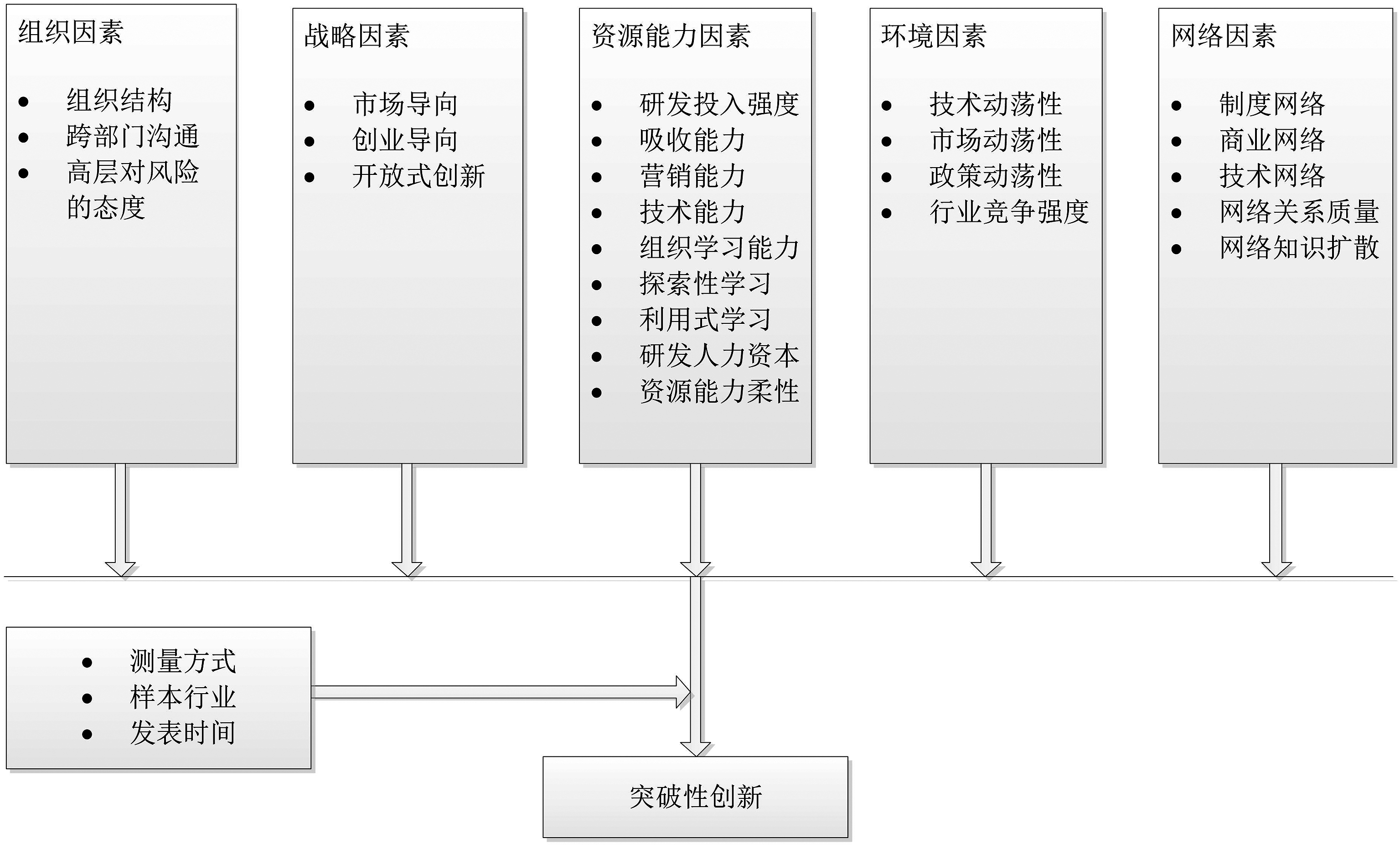 国外突破性创新研究已经开展了将近30年,国内突破性创新研究虽然起步较晚,但近年来,学者们从组织、战略、资源能力、环境以及网络等角度对突破性创新关键驱动因素进行了深入探讨。