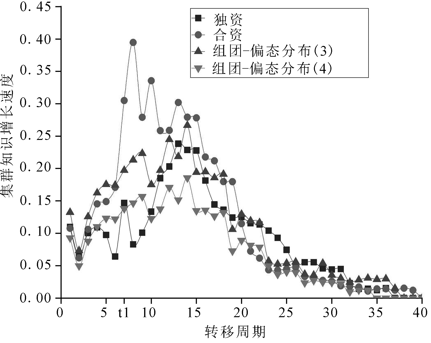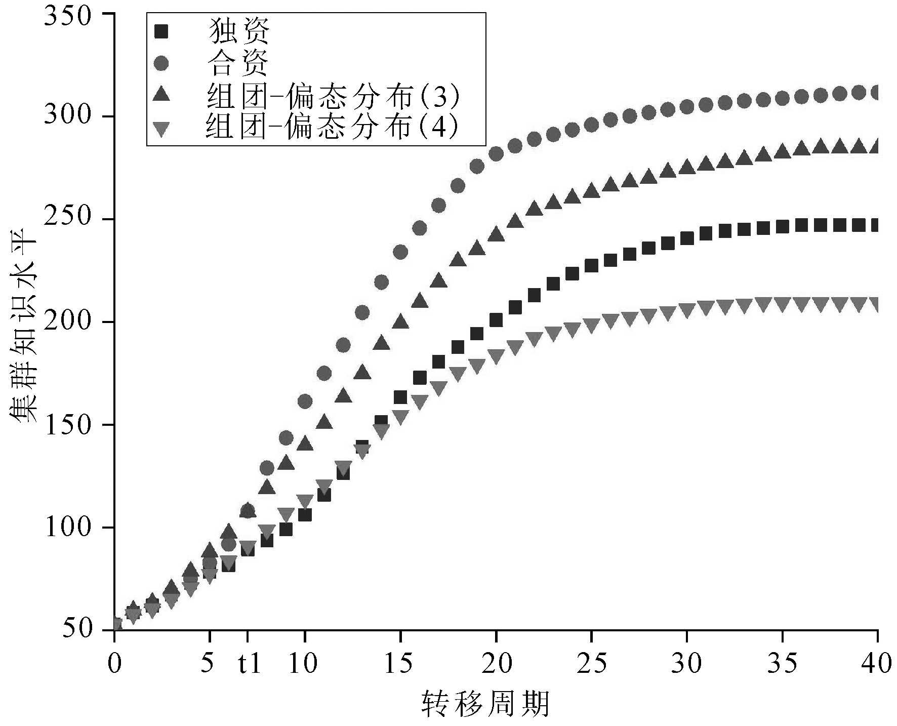 图8和图9反映了集群知识增长速度及知识水平。由此可知,集群知识增长速度及知识水平基本保持为偏态分布(3)>偏态分布(4),说明转移企业形成的“小社团”对集群知识转移有显著负向影响。当转移企业的“小社团”强度较小时,最终的集群知识水平高于独资模式,但低于合资模式。但当“小社团”强度过大时,集群知识水平低于独资及合资模式。结果表明,尽管组团式转移企业的进入带来了新知识,但为了保持原有的独特竞争优势,或是基于亲缘、地缘等关系形成的“小社团”,会制约其与集群企业建立关系、开展知识交流互动,进而对知识转移绩效产生较大影响。
