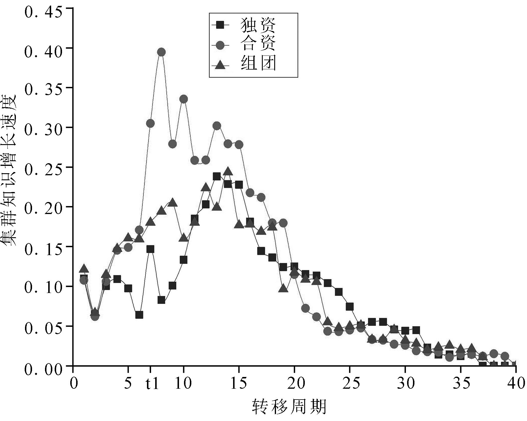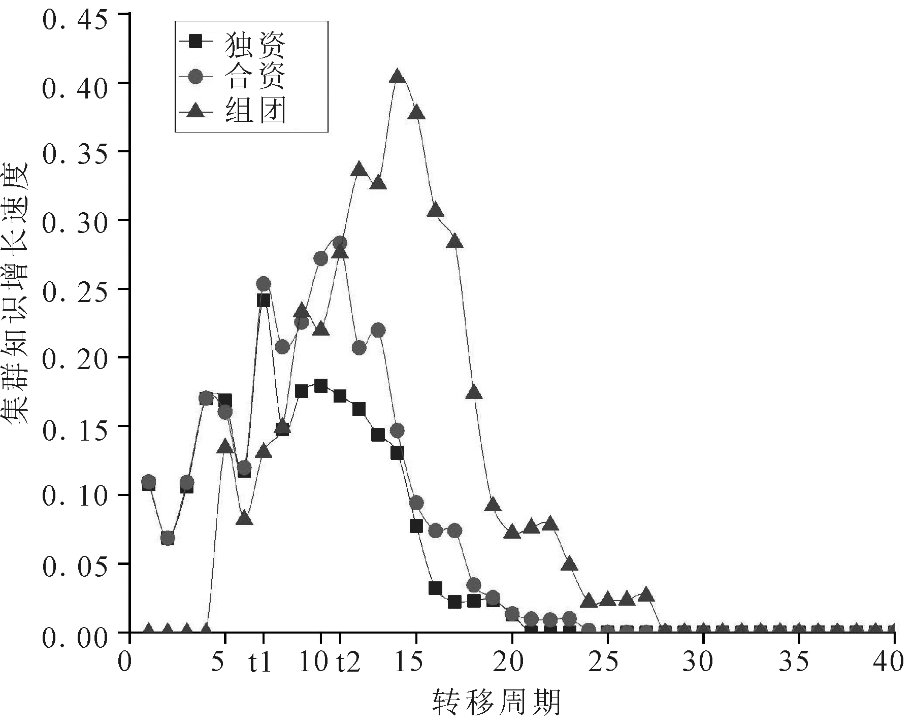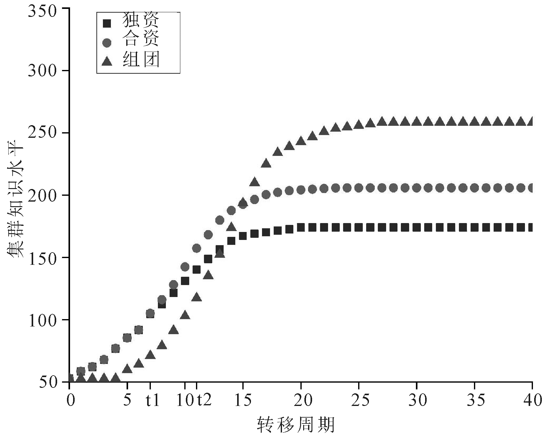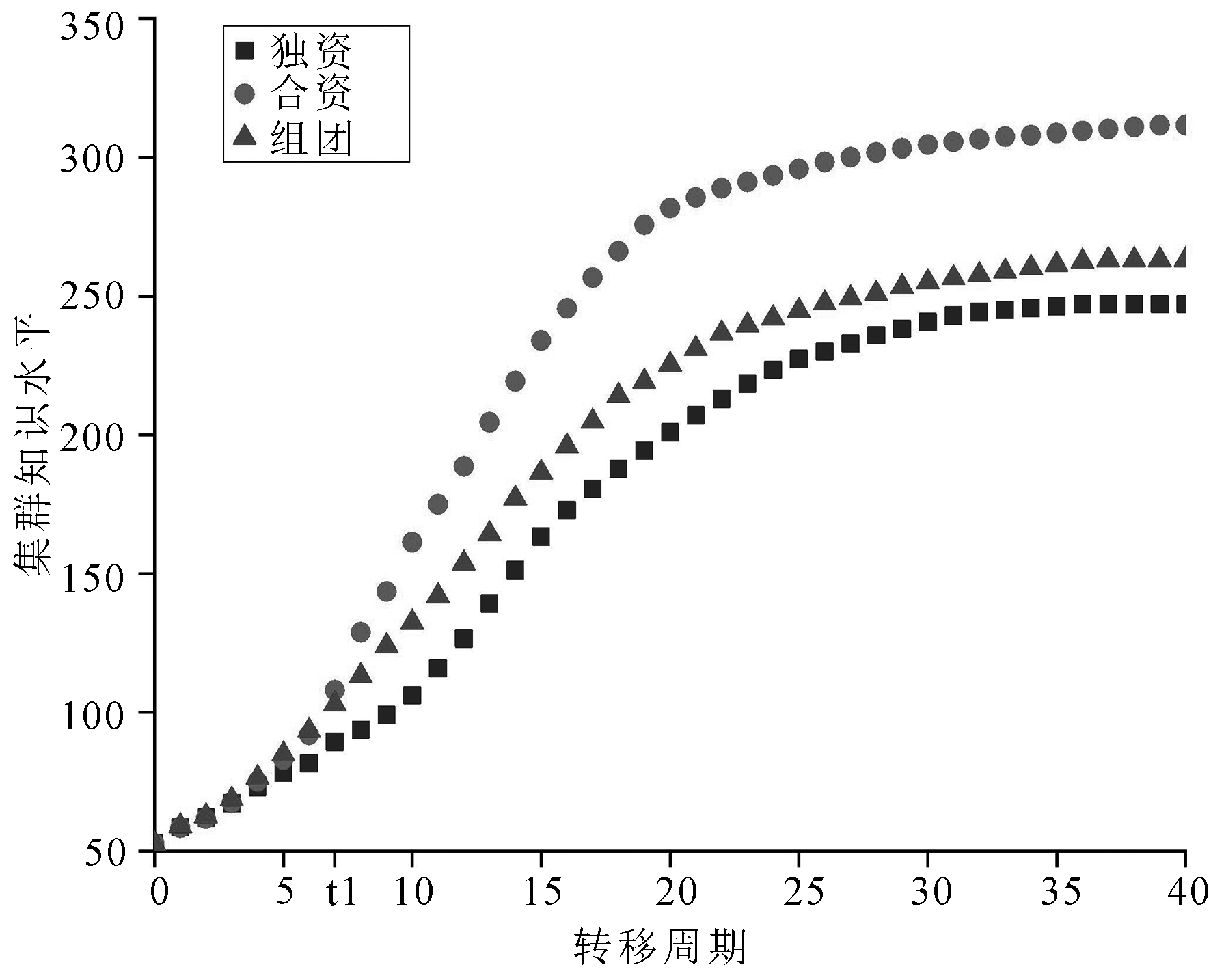 图2和图3分别显示了在无核网络中3种企业转移模式下的集群知识增长速度及知识水平。由图2可知,在组团转移模式下的企业转移初始阶段,集群知识的增长速度为零,说明此时转移企业尚未发生知识转移(见图3),这是因为在无核网络中组团式转移企业在转移初期仍保持与原集群企业的合作关系,尚未与承接地集群企业建立关系。这也导致了组团式转移企业商业网络及技术网络的嵌入时间晚于独资及合资模式,其中,独资及合资模式下企业技术网络嵌入时间记为t1,组团式转移模式下记为t2。由图2及图3可知,0-t1阶段独资及合资模式下集群知识的增长速度基本相同,使得此阶段独资及合资模式下的集群知识水平也基本相同。这是因为网络嵌入初期主要是商业网络嵌入,因此独资及合资模式下的知识转移速度基本相同。在t1周期后,独资及合资模式下的转移企业逐步构建了技术网络,但是合资模式下集群知识的增长速度高于独资模式,这是因为独资企业具有较强知识保护意愿,会通过减少技术联系以防止核心知识泄露,致使集群知识增长速度较低,而合资企业为了获取外部知识,在当地合作者的帮助下,通过建立更多技术关系以增加访问及学习集群知识的机会,与此同时,增加了企业向集群企业转移知识的机会。t2周期后,随着组团式转移企业逐步建立起技术网络,集群知识的增长速度明显大于独资及合资模式,使得集群知识水平从高到低依次为组团转移模式>合资模式>独资模式。这是因为组团式转移企业的知识存量大于独资及合资模式,使得此模式下集群知识增长速度的波动性明显大于独资及合资模式,特别是组团式转移企业实施技术网络嵌入后,集群知识的增长速度大幅提升。综上,在无核网络中,尽管组团式转移企业在转移初期未发生知识转移,但从长远看,其更能提高集群知识水平,其次分别是合资模式、独资模式。结果表明,转移企业网络嵌入和企业知识势差是引起知识转移的前提,转移企业与集群企业的合作、知识互动关系建立以及转移企业的知识存量都将影响集群知识增长速度和水平。