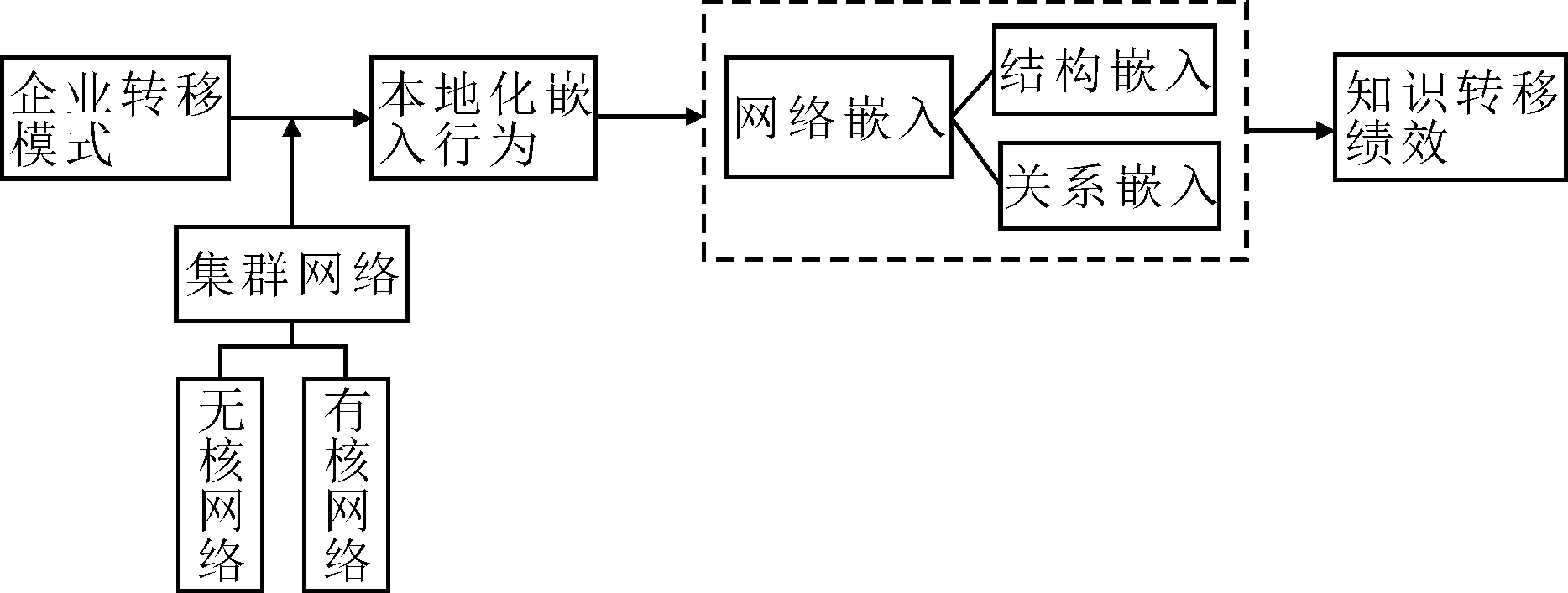 跨国企业发展战略的相关研究表明,企业市场寻求、资源寻求的战略目标决定了企业转移模式,即特定转移模式反映了企业的迁入动机——获取承接地市场、自然资源抑或集群知识等,因此转移模式是影响企业本地化嵌入行为的重要因素。此外,组织行为是嵌入在一定社会关系中的,转移企业的本地化嵌入行为还会受到承接地网络环境的影响[10]。在产业集群研究中,集群内有无核心企业是区分集群网络结构的重要因素。根据是否存在核心企业,可将集群网络分为无核网络与有核网络两类[11]。因此,转移企业在其战略目标指引下,根据承接地集群市场、知识等需求差异,以及承接地集群网络特征,会表现出不同的本地化嵌入行为以获取目标资源。这种本地化嵌入行为表现为转移企业嵌入承接地网络的方式。网络是知识转移的载体,转移企业在嵌入承接地集群过程中虽然不会考虑知识溢出效果,但在获取承接地集群资源及知识,以及与承接地企业合作与交流过程中也会伴随知识转移及扩散活动,从而实现承接地知识转移。网络嵌入包括结构嵌入和关系嵌入两个维度[12],不同网络嵌入方式会影响知识转移速度及范围,最终影响知识转移绩效。