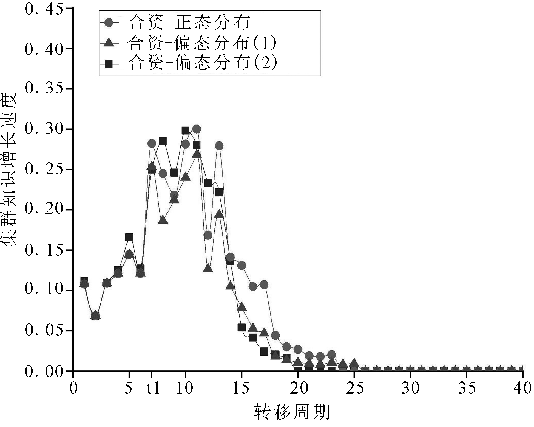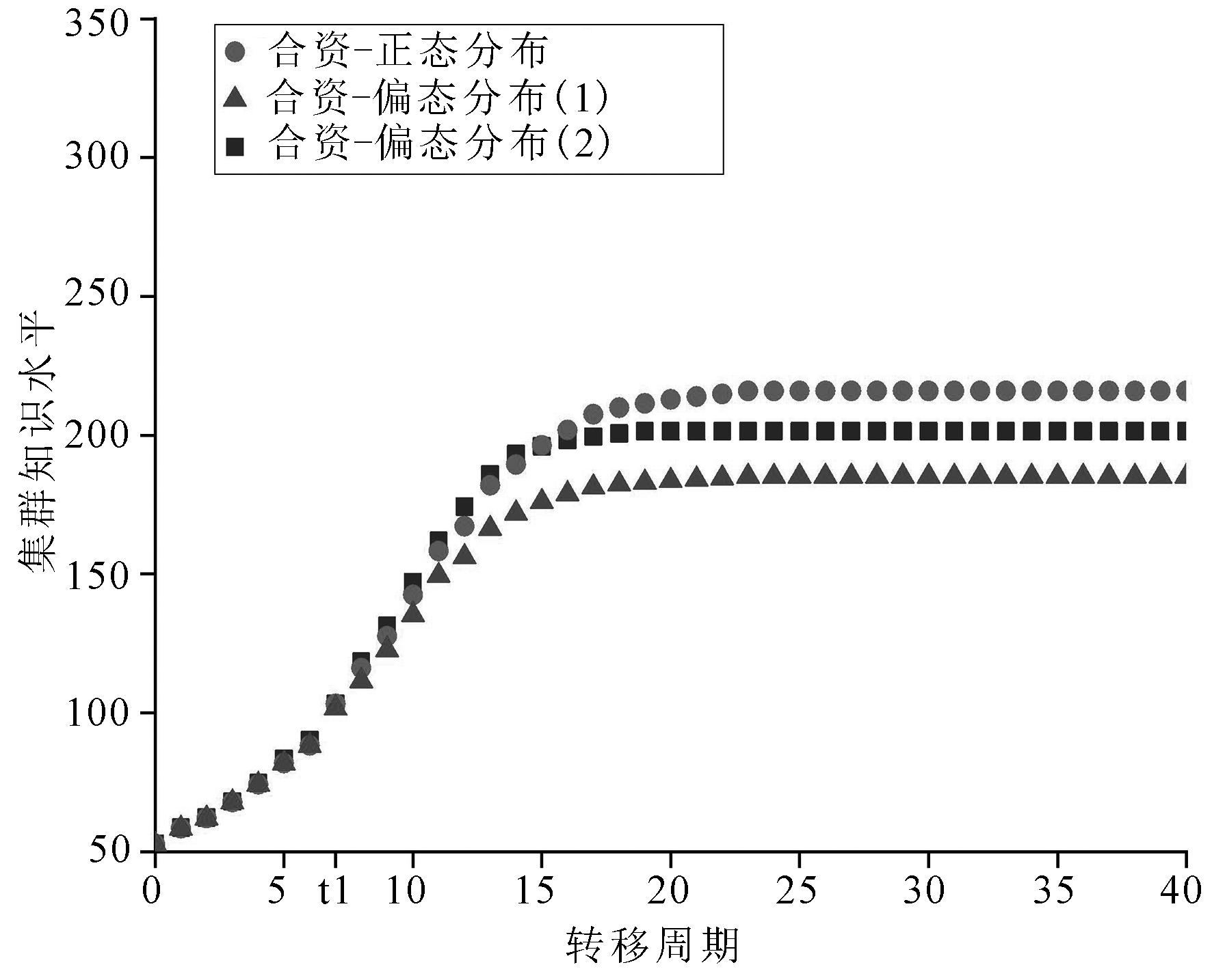 合资企业网络联结节点更新概率越大,表明联结关系越不稳定,即合资企业频繁变换集群中与其建立联结的交往企业。根据前述理论分析,在模拟中设定无核网络中合资模式下的网络更新概率q1服从(0.2, 1)均匀分布。由于社会现象大多呈现正态分布特征,在不同产业集群中合资企业联结节点的更新概率也存在差异,因此在模拟中,可将更新概率按不同均值的正态分布进行设定,以进一步探讨不同集群中合资企业联结节点更新概率对知识转移绩效的影响。在无核网络中,合资企业网络节点更新概率与合资企业知识需求以及集群企业的资源承诺有关。当集群以IT、软件和半导体等高新技术产业为代表时,其技术创新意识和知识引进意识较强,知识更新周期短,知识要求高,当承接地集群企业的资源承诺水平较高且能在一定时限满足转移企业需求时,企业更新联结节点的概率较小。因此,对于以IT、软件和半导体等知识承诺要求较高的高新技术产业集群,可按照承接地集群对转入企业资源承诺的差异,区分节点更新概率:当集群企业的资源承诺度较低时,设定网络更新概率q1服从均值度0.8、标准差为0.1的偏态分布(1),即95.4%的概率位于[0.6, 1]内。当集群企业的资源承诺度较高时,合资企业联结节点的更新概率q1服从均值为0.5、标准差为0.1的正态分布,即95.4%的概率位于[0.3, 0.7]内。对于企业运营与技术应用稳定、工艺成熟的工业生产型产业集群,如国内温州制鞋、绍兴纺织等产业集群,其网络联结节点更新较少,可设定网络联结的重置概率q1服从均值为0.3、标准差0.05的偏态分布(2),即95.4%的概率位于[0.2, 0.4]内。