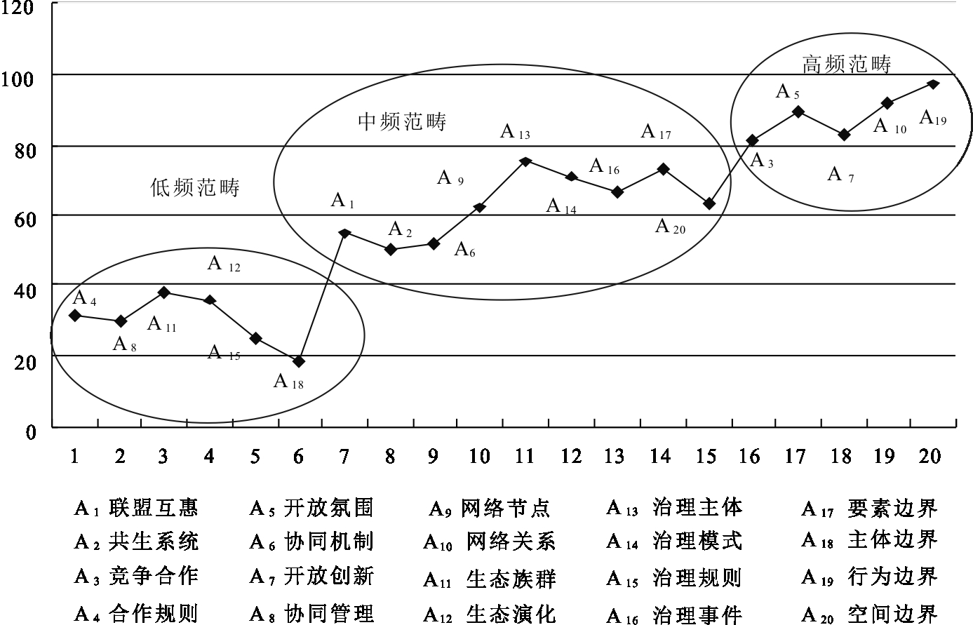 为保证概念归类的一致性,通过计算Cohen′s Kappa系数判断一致性误差是否处于可接受水平。范畴归类一致性系数分别为:联盟互惠 70.49%、共生系统66.35%、竞争合作61.44%、合作规则72.29%,其它范畴的一致性系数都在60%以上,编码总体一致率为70.10%,由此判定初始概念的编码一致性检验符合标准。接下来,文本挖掘小组根据联盟互惠、共生系统、竞争合作、合作规则等20个典型范畴在语句中出现的频率,将其分为3类:低频范畴、中频范畴和高频范畴,具体划分标准为:低频范畴≤40次、40次<中频范畴≤80次和高频范畴>80次,如图1所示。图1中,下半部分表示20个典型范畴的编号,即A1—联盟互惠,A2—共生系统,A3—竞争合作,A4—合作规则等。上半部分表示范畴出现的频率,低频范畴共有6个,其中,合作规则32次,协同管理30次,生态族群38次等;中频范畴共有9个,其中,联盟互惠55次,共生关系50次,协同机制52次,网络节点62次等;高频范畴共有5个,其中,竞争合作81次,开放氛围89次,网络关系92次等。