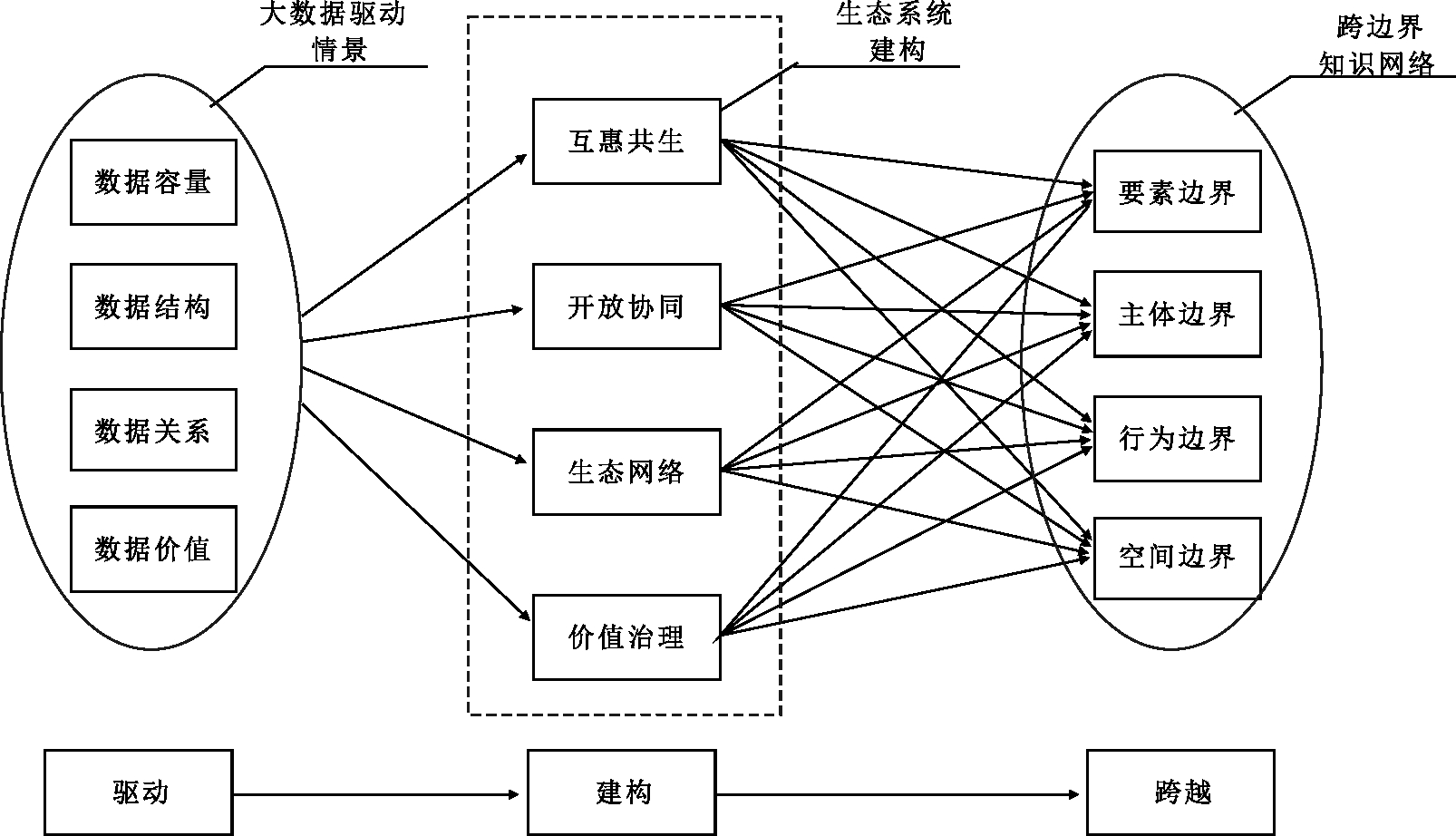 (3)由生态系统建构延伸,可将跨边界知识网络划分为要素边界、主体边界、行为边界和空间边界4个维度,据此,文本挖掘的故事线提炼为“驱动→建构→跨越”,对应两类关系路径分别是大数据驱动情景→生态系统建构和生态系统建构→跨边界知识网络。