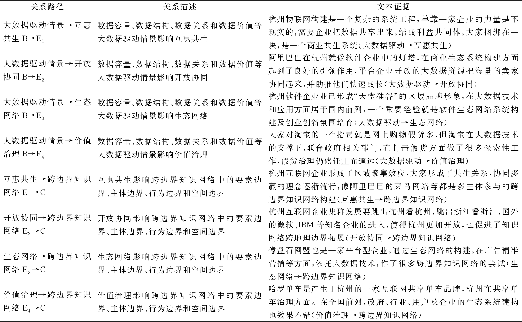 关系路径关系描述文本证据大数据驱动情景→互惠共生B→E1数据容量、数据结构、数据关系和数据价值等大数据驱动情景影响互惠共生杭州物联网构建是一个复杂的系统工程,单靠一家企业的力量是不现实的,需要企业把数据共享出来,结成利益共同体,大家捆绑在一块,是一个商业共生系统(大数据驱动→互惠共生)大数据驱动情景→开放协同B→E2数据容量、数据结构、数据关系和数据价值等大数据驱动情景影响开放协同阿里巴巴在杭州就像软件企业中的灯塔,在商业生态系统构建方面起到了良好的引领作用,平台企业开放的大数据资源把海量的卖家协同起来,并助推他们快速成长(大数据驱动→开放协同)大数据驱动情景→生态网络B→E3数据容量、数据结构、数据关系和数据价值等大数据驱动情景影响生态网络杭州软件企业业已形成“天堂硅谷”的区域品牌形象,在大数据技术和应用方面居于国内前列,一个重要经验就是软件生态网络系统构建及创业创新氛围培育(大数据驱动→生态网络)大数据驱动情景→价值治理B→E4数据容量、数据结构、数据关系和数据价值等大数据驱动情景影响价值治理大家对淘宝的一个指责就是网上购物假货多,但淘宝在大数据技术的支撑下,联合政府相关部门,在打击假货方面做了很多探索性工作,假货治理仍然任重而道远(大数据驱动→价值治理)互惠共生→跨边界知识网络E1→C互惠共生影响跨边界知识网络中的要素边界、主体边界、行为边界和空间边界杭州互联网企业形成了区域聚集效应,大家形成了共生关系,协同多赢的理念逐渐流行,像阿里巴巴的菜鸟网络等都是多主体参与的跨边界知识网络构建(互惠共生→跨边界知识网络)开放协同→跨边界知识网络E2→C开放协同影响跨边界知识网络中的要素边界、主体边界、行为边界和空间边界杭州互联网企业集群发展要跳出杭州看杭州,跳出浙江看浙江,国外的微软、IBM等知名企业的进入,使得杭州更加开放,也促进了知识网络跨地理边界拓展(开放协同→跨边界知识网络)生态网络→跨边界知识网络E3→C生态网络影响跨边界知识网络中的要素边界、主体边界、行为边界和空间边界像盘石网盟也是一家平台型企业,通过生态网络的构建,在广告精准营销等方面,依托大数据技术,作了很多跨边界知识网络的尝试(生态网络→跨边界知识网络)价值治理→跨边界知识网络E4→C价值治理影响跨边界知识网络中的要素边界、主体边界、行为边界和空间边界哈罗单车是产生于杭州的一家互联网共享单车品牌,杭州在共享单车治理方面走在全国前列,政府、行业、用户及企业的生态系统建构也效果不错(价值治理→跨边界知识网络)