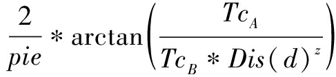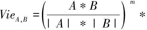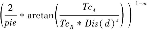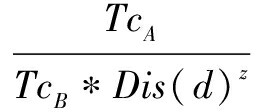 其中,VieA,B表示城市CA对城市CB造成的竞争压力,A和B分别表示城市CA、城市CB的产业结构向量,TcA、TcB表示城市CA、城市CB的产业总体量,Dis(d)z表示两地的距离函数,pie=3.14 。对于式(1)中不同部分的解释如下:①