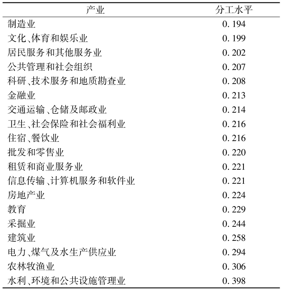 产业分工水平制造业0.194文化、体育和娱乐业0.199居民服务和其他服务业0.202公共管理和社会组织0.207科研、技术服务和地质勘查业0.208金融业0.213交通运输、仓储及邮政业0.214卫生、社会保险和社会福利业0.216住宿、餐饮业0.216批发和零售业0.220租赁和商业服务业0.221信息传输、计算机服务和软件业0.221房地产业0.224教育0.229采掘业0.244建筑业0.258电力、煤气及水生产供应业0.294农林牧渔业0.306水利、环境和公共设施管理业0.398