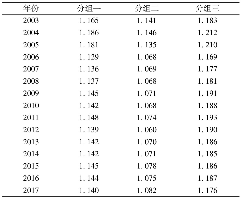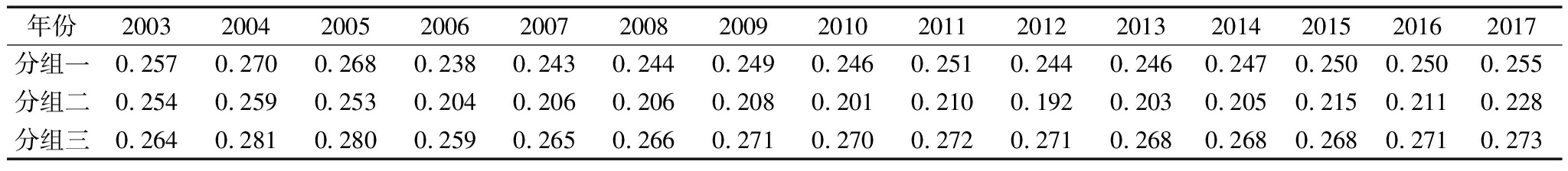 年份200320042005200620072008200920102011201220132014201520162017分组一0.2570.2700.2680.2380.2430.2440.2490.2460.2510.2440.2460.2470.2500.2500.255分组二0.2540.2590.2530.2040.2060.2060.2080.2010.2100.1920.2030.2050.2150.2110.228分组三0.2640.2810.2800.2590.2650.2660.2710.2700.2720.2710.2680.2680.2680.2710.273