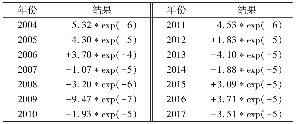 年份结果年份结果2004-5.32∗exp(-6)2011-4.53∗exp(-6)2005-4.30∗exp(-5)2012+1.83∗exp(-5)2006+3.70∗exp(-4)2013-4.10∗exp(-5)2007-1.07∗exp(-5)2014-1.88∗exp(-5)2008-3.20∗exp(-6)2015+3.09∗exp(-5)2009-9.47∗exp(-7)2016+3.71∗exp(-5)2010-1.93∗exp(-5)2017-3.51∗exp(-5)