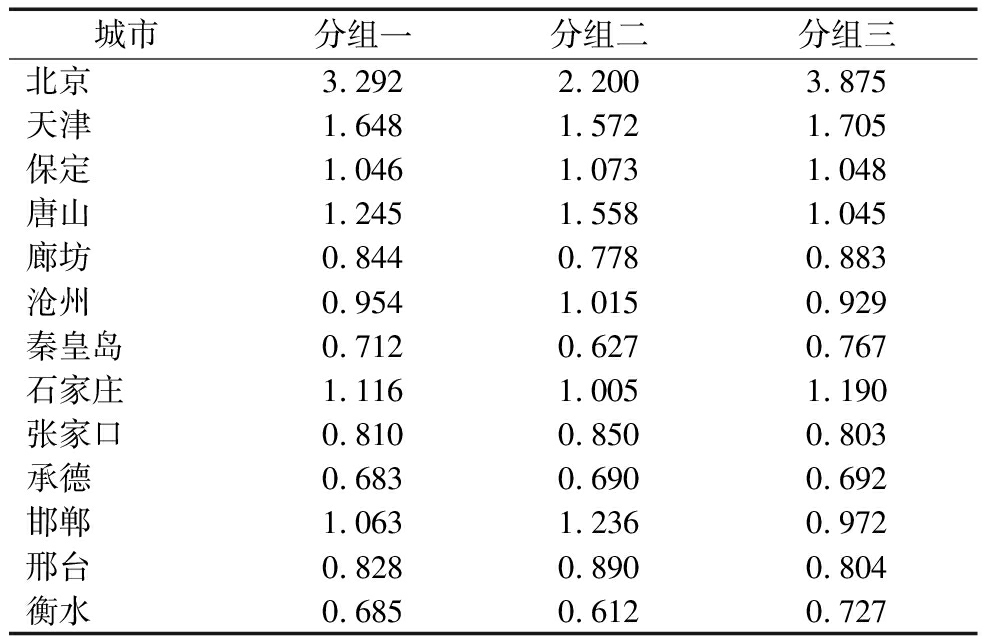 总体来看,北京在3个分组中的效率水平均最高,分别为3.292、2.200、3.875,并且3个分组的效率水平均远高于排名第二的天津。天津与北京效率水平结构类似,分组三的效率水平大于分组二和分组一。效率水平排名第三的唐山,分组二的效率水平最高,为1.558。廊坊、秦皇岛、张家口、承德、邢台和衡水3个分组效率水平均值均小于1,在城市群中的竞争力较弱。其中,衡水各分组的效率水平均最低,分别为0.685、0.612和0.727,张家口在分组二的效率水平为0.850,高于分组三的效率水平0.803,意味着张家口的一二产业相对于三产业更有竞争力,表明作为生态涵养区的张家口还没有很好地完成转型。