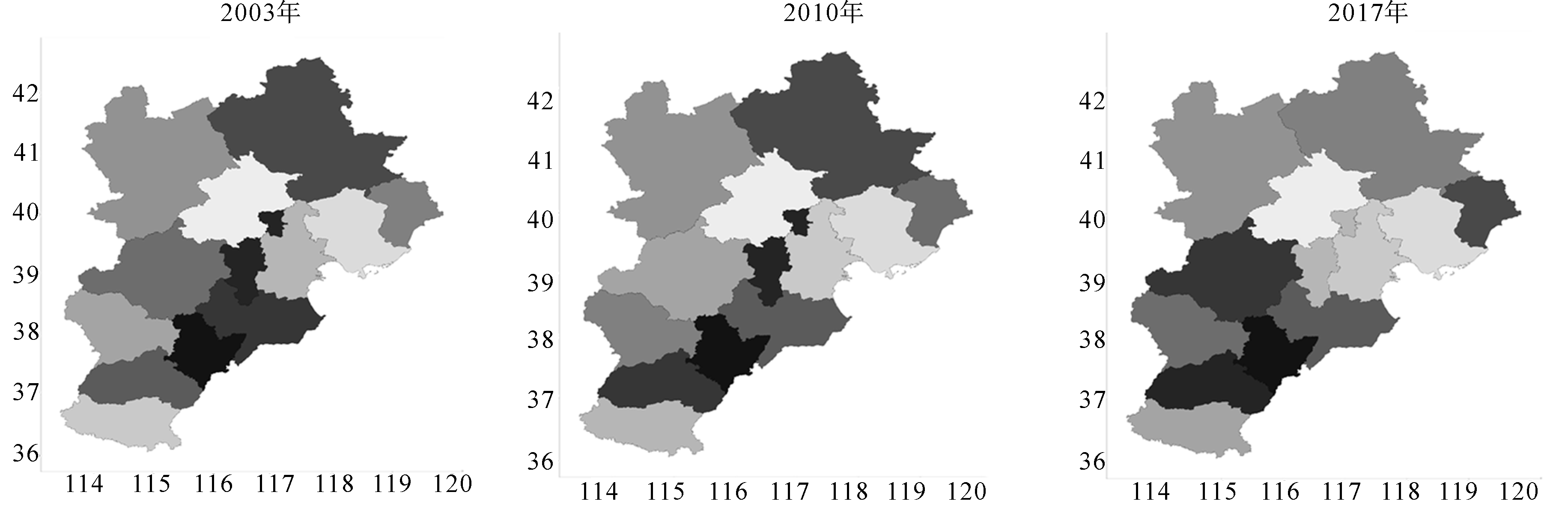城市竞争压力空间分布如图1所示,可以发现,相较于2003年和2010年,京津冀城市群东北部城市在2017年面临的竞争压力总体处于下降状态。其中,张家口、承德、廊坊的竞争压力在不断下降, 唐山和天津面临的竞争压力总体维持在稳定的水平,仅秦皇岛的城市竞争压力有显著上升。京津冀城市群西南部城市在2017年面临的竞争压力在不断攀升。由此可以明显看出,京津冀城市群中围绕北京的城市竞争压力不断下降,意味着环首都的城市分工不断深化。但是,京津冀城市群的竞争压力向西南部转移,保定、石家庄、衡水、邢台和邯郸的竞争压力有着明显攀升。