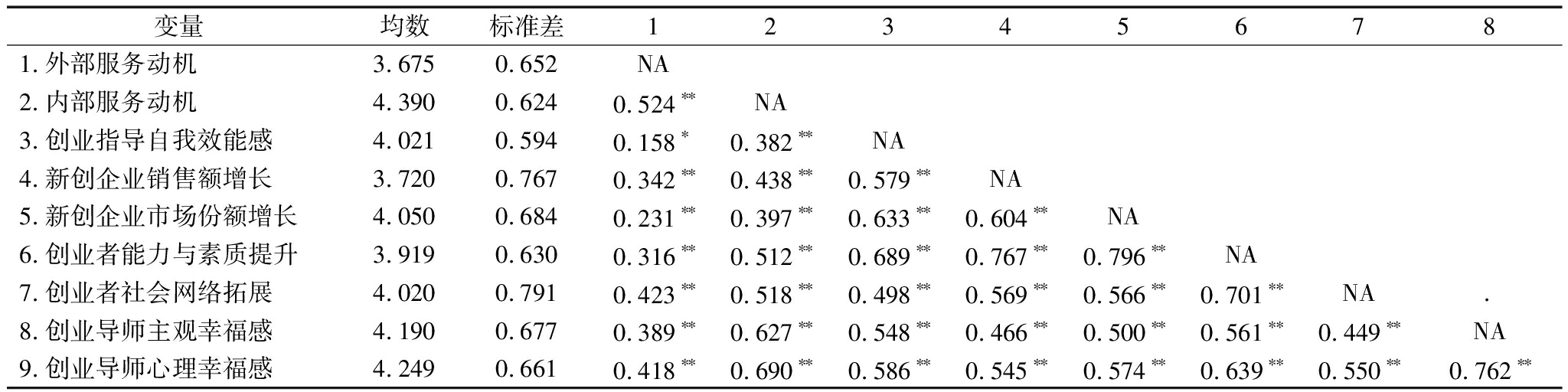 变量均数标准差123456781.外部服务动机3.6750.652NA2.内部服务动机4.3900.6240.524∗∗NA3.创业指导自我效能感4.0210.5940.158∗0.382∗∗NA4.新创企业销售额增长3.7200.7670.342∗∗0.438∗∗0.579∗∗NA5.新创企业市场份额增长4.0500.6840.231∗∗0.397∗∗0.633∗∗0.604∗∗NA6.创业者能力与素质提升3.9190.6300.316∗∗0.512∗∗0.689∗∗0.767∗∗0.796∗∗NA7.创业者社会网络拓展4.0200.7910.423∗∗0.518∗∗0.498∗∗0.569∗∗0.566∗∗0.701∗∗NA.8.创业导师主观幸福感4.1900.6770.389∗∗0.627∗∗0.548∗∗0.466∗∗0.500∗∗0.561∗∗0.449∗∗NA9.创业导师心理幸福感4.2490.6610.418∗∗0.690∗∗0.586∗∗0.545∗∗0.574∗∗0.639∗∗0.550∗∗0.762∗∗