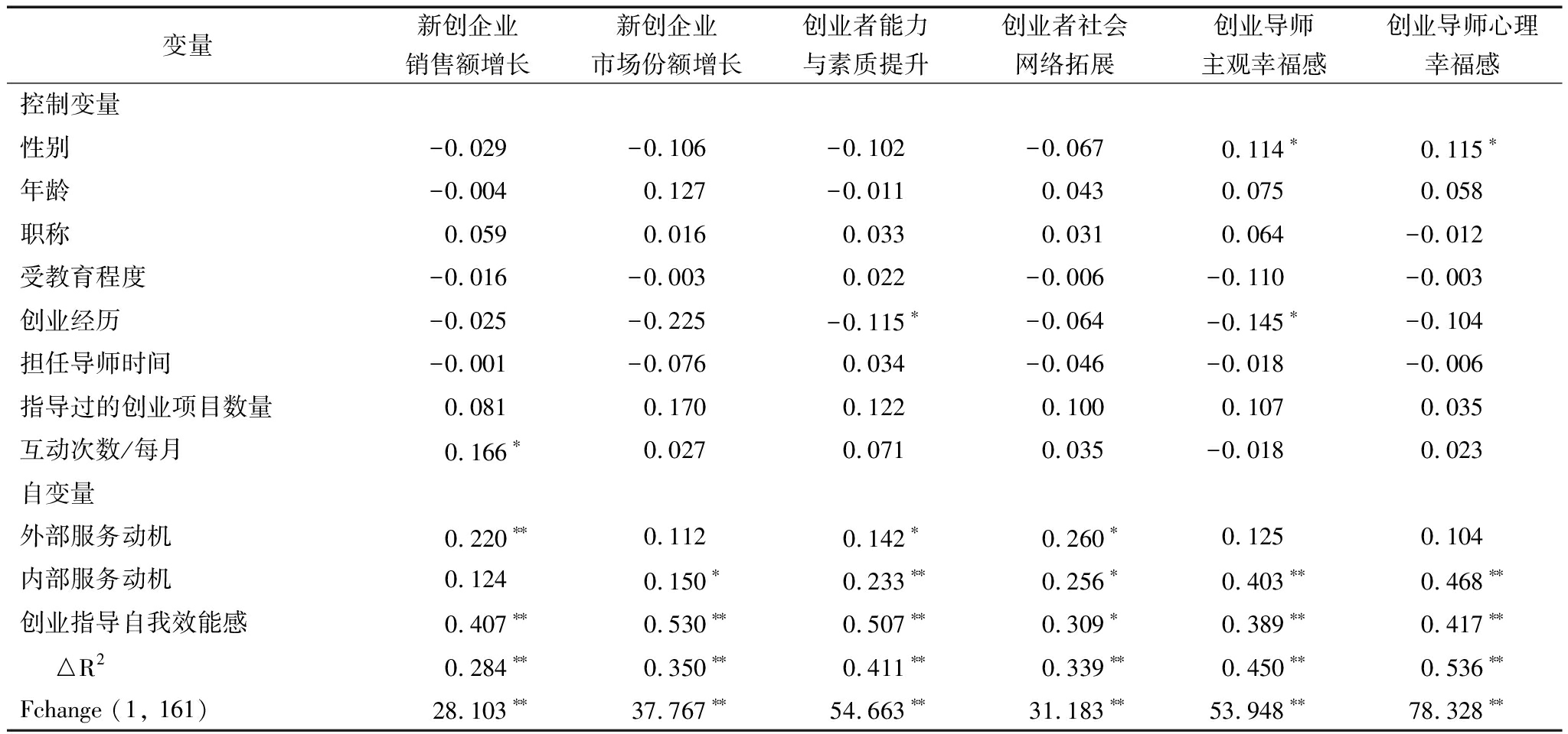 变量新创企业销售额增长新创企业市场份额增长创业者能力与素质提升创业者社会网络拓展创业导师主观幸福感创业导师心理幸福感控制变量 性别-0.029-0.106-0.102-0.0670.114∗0.115∗ 年龄-0.0040.127-0.0110.0430.0750.058 职称0.0590.0160.0330.0310.064-0.012 受教育程度-0.016-0.0030.022-0.006-0.110-0.003 创业经历-0.025-0.225-0.115∗-0.064-0.145∗-0.104 担任导师时间-0.001-0.0760.034-0.046-0.018-0.006 指导过的创业项目数量0.0810.1700.1220.1000.1070.035 互动次数/每月0.166∗0.0270.0710.035-0.0180.023自变量 外部服务动机0.220∗∗0.1120.142∗0.260∗0.1250.104 内部服务动机0.1240.150∗0.233∗∗0.256∗0.403∗∗0.468∗∗ 创业指导自我效能感0.407∗∗0.530∗∗0.507∗∗0.309∗0.389∗∗0.417∗∗ △R20.284∗∗0.350∗∗0.411∗∗0.339∗∗0.450∗∗0.536∗∗Fchange (1, 161)28.103∗∗37.767∗∗54.663∗∗31.183∗∗53.948∗∗78.328∗∗