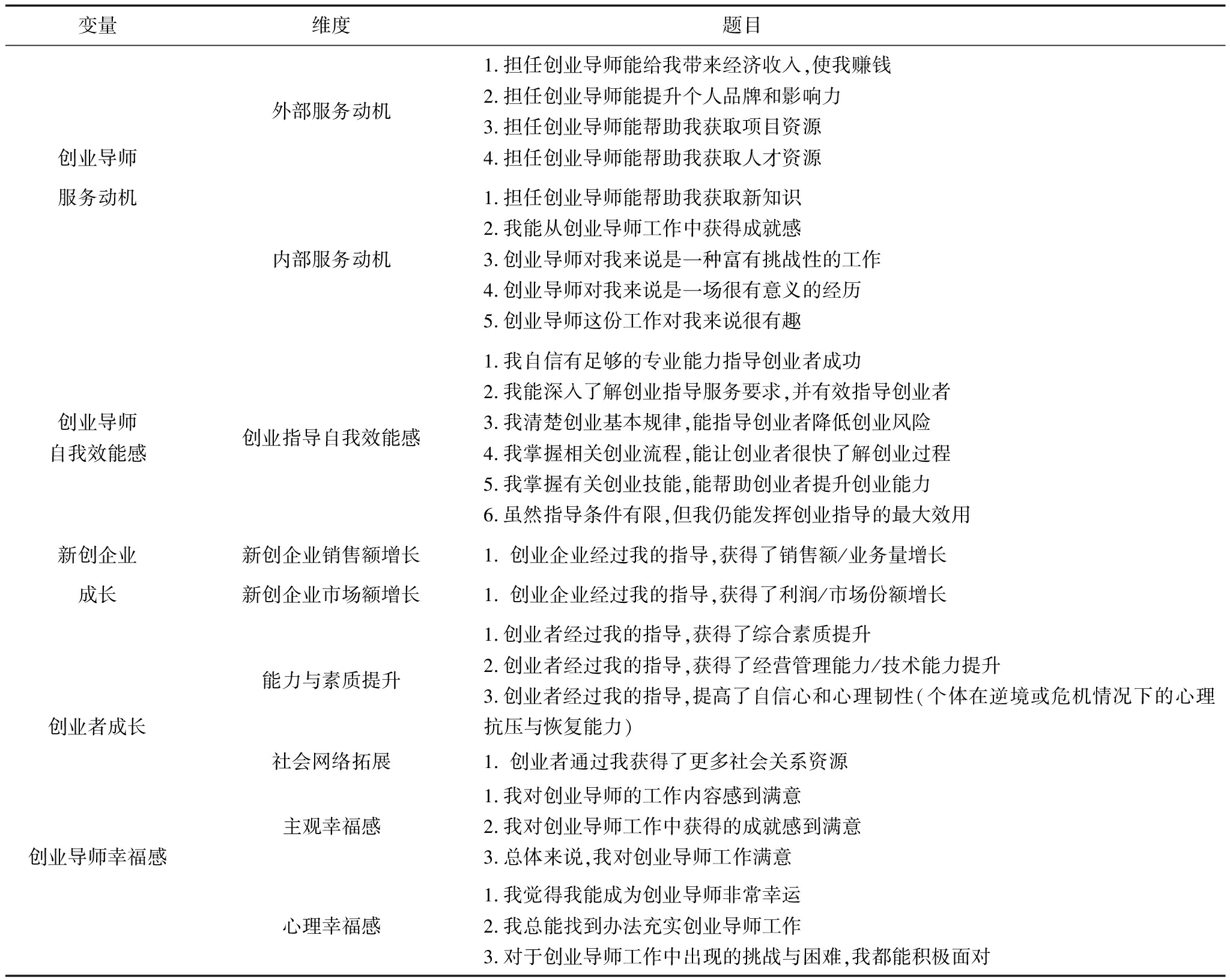 变量维度题目创业导师外部服务动机1.担任创业导师能给我带来经济收入,使我赚钱2.担任创业导师能提升个人品牌和影响力3.担任创业导师能帮助我获取项目资源4.担任创业导师能帮助我获取人才资源服务动机内部服务动机1.担任创业导师能帮助我获取新知识2.我能从创业导师工作中获得成就感3.创业导师对我来说是一种富有挑战性的工作4.创业导师对我来说是一场很有意义的经历5.创业导师这份工作对我来说很有趣创业导师自我效能感创业指导自我效能感1.我自信有足够的专业能力指导创业者成功2.我能深入了解创业指导服务要求,并有效指导创业者3.我清楚创业基本规律,能指导创业者降低创业风险4.我掌握相关创业流程,能让创业者很快了解创业过程5.我掌握有关创业技能,能帮助创业者提升创业能力6.虽然指导条件有限,但我仍能发挥创业指导的最大效用新创企业新创企业销售额增长1. 创业企业经过我的指导,获得了销售额/业务量增长成长新创企业市场额增长1. 创业企业经过我的指导,获得了利润/市场份额增长创业者成长能力与素质提升1.创业者经过我的指导,获得了综合素质提升2.创业者经过我的指导,获得了经营管理能力/技术能力提升3.创业者经过我的指导,提高了自信心和心理韧性(个体在逆境或危机情况下的心理抗压与恢复能力)社会网络拓展1. 创业者通过我获得了更多社会关系资源创业导师幸福感主观幸福感1.我对创业导师的工作内容感到满意2.我对创业导师工作中获得的成就感到满意3.总体来说,我对创业导师工作满意心理幸福感1.我觉得我能成为创业导师非常幸运2.我总能找到办法充实创业导师工作3.对于创业导师工作中出现的挑战与困难,我都能积极面对