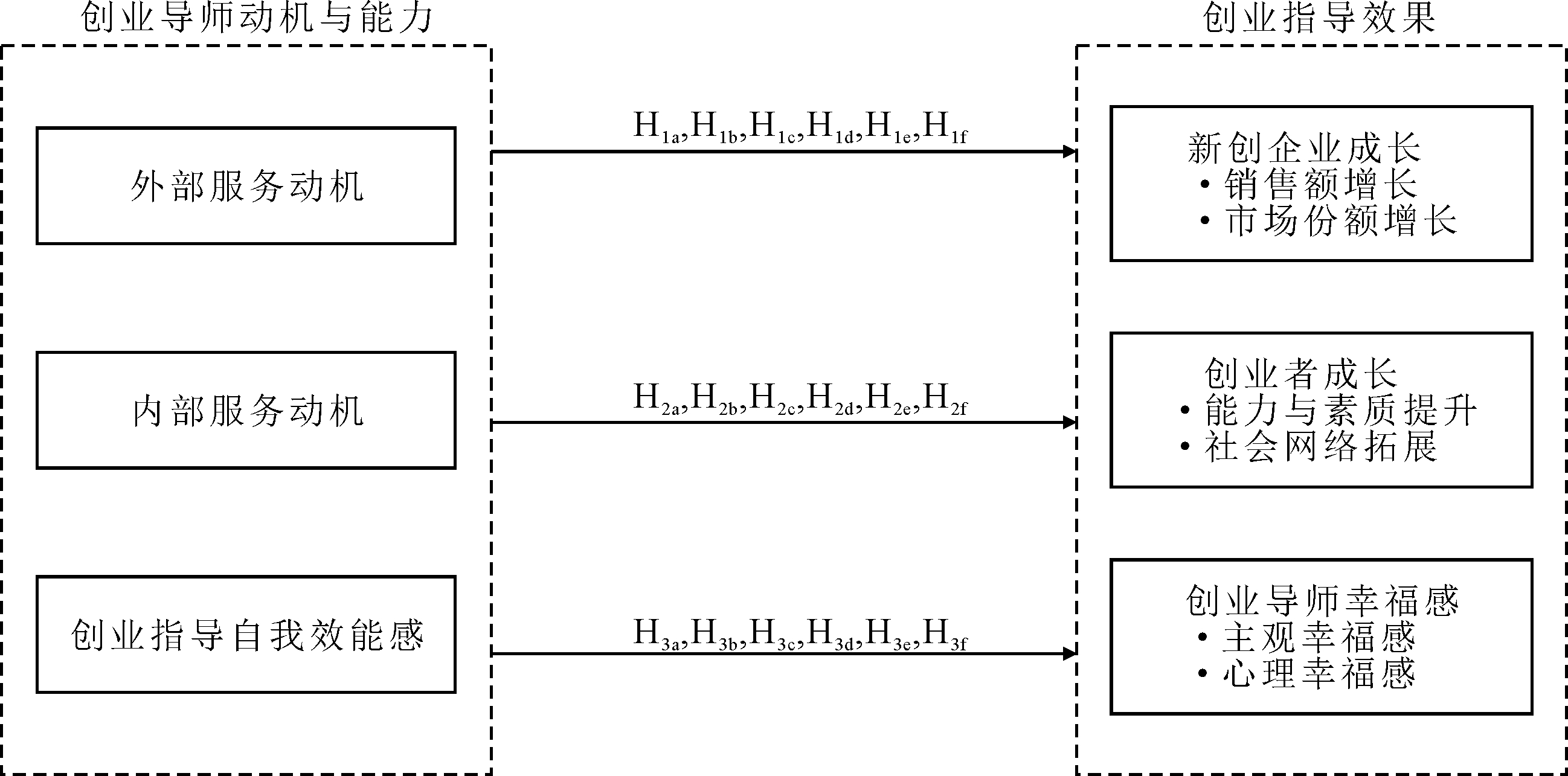 H1:创业导师外部服务动机与新创企业销售额增长(H1a)、新创企业市场份额增长(H1b)、创业者能力与素质提升(H1c)、创业者社会网络拓展(H1d)、创业导师主观幸福感(H1e)、创业导师心理幸福感(H1f)显著正相关。