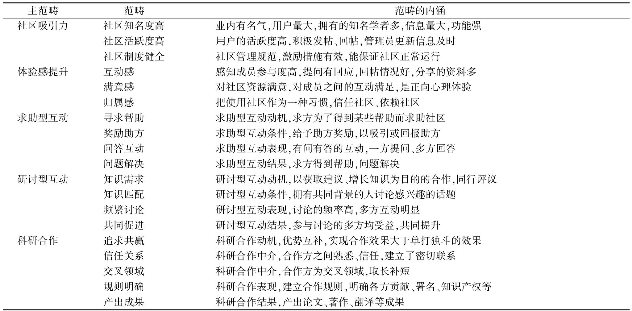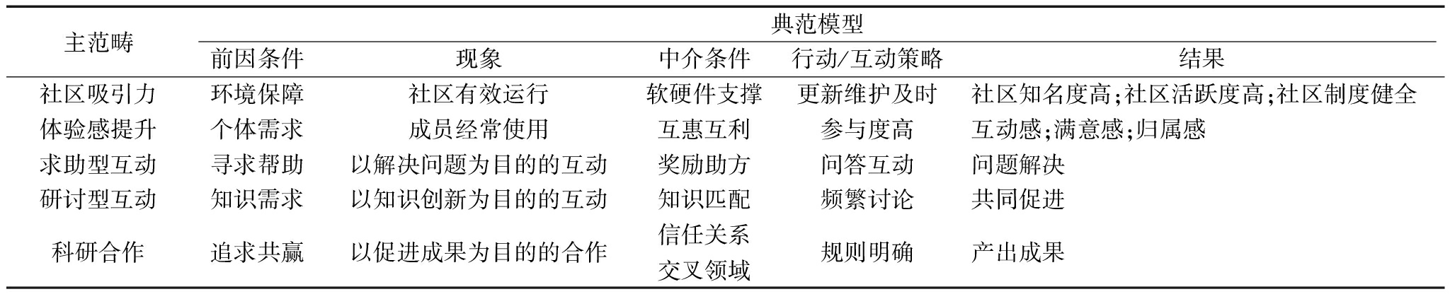 主轴编码旨在建立范畴之间的关系,通过重新审视研究问题对原始材料进行反复阅读,运用编码典范模型“前因条件→现象→中介条件→行动/互动策略→结果”,梳理范畴之间的关系,得到5个主范畴分别为社区吸引力、体验感提升、求助型互动、研讨型互动和科研合作,并形成了可以验证每个主范畴的证据链,如表2所示。以“求助型互动”主范畴为例:前因条件是求方在社区寻求帮助;现象是社区中出现了以解决问题为目的的互动;中介条件是促使互动达成的条件,即求方给予助方奖励作为回报;行动/互动策略是求方与助方的互动,可能是一对一也可能是一对多;结果是求方问题得以解决。本文分别从动机(前因条件)、中介(中介条件)、表现(行动/互动策略)和结果(结果)4个方面描述 “求助型互动”这一主范畴。主范畴与范畴的对应关系以及每个范畴的具体内涵如表3所示。