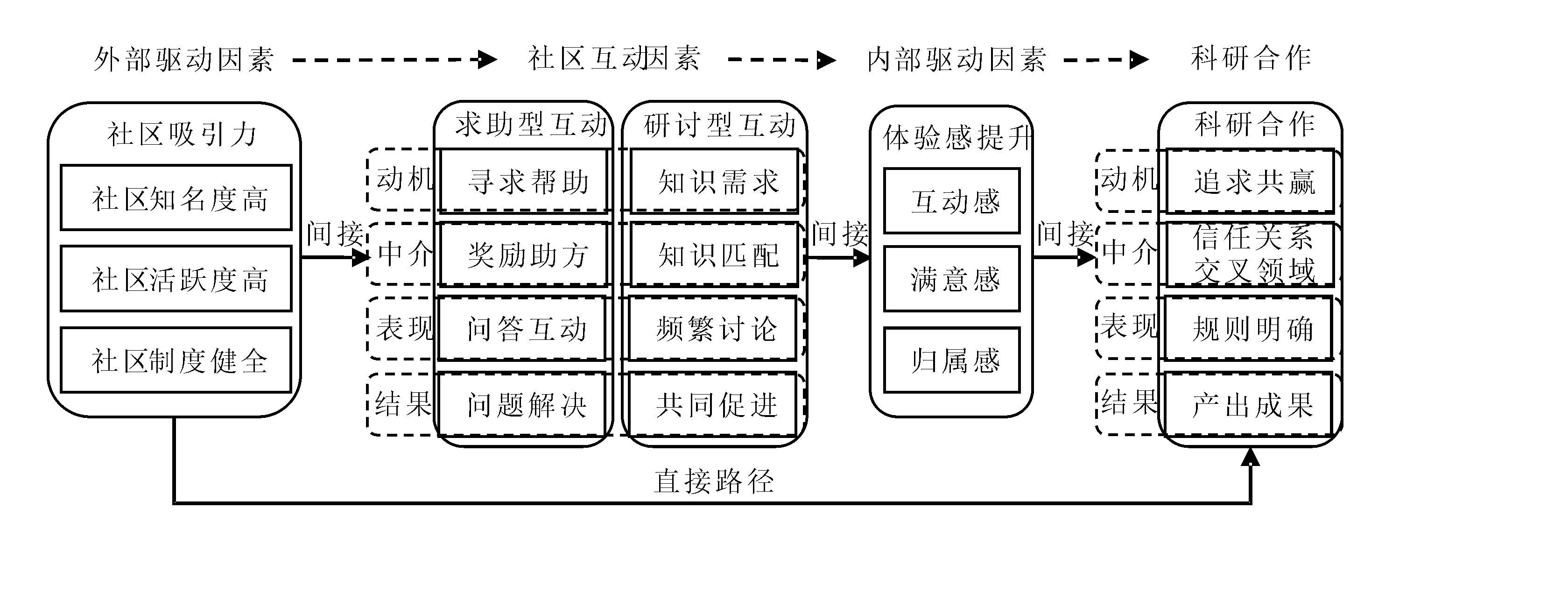 (2)虚拟学术社区促进下形成的科研合作,动机是追求共赢,中介是信任关系和交叉领域,表现是规则明确,结果是产出成果。科研合作形成路径有两条:①通过外部驱动因素(社区吸引力)直接作用形成,即外在直接影响;②通过外部驱动因素影响社区互动因素(求助型互动、研讨型互动),再影响内部驱动因素(体验感提升)的间接作用形成,即内在机理影响。相比外在直接影响,内在机理影响由于经历了长时间的社区互动,形成的科研合作关系更稳定、可靠。