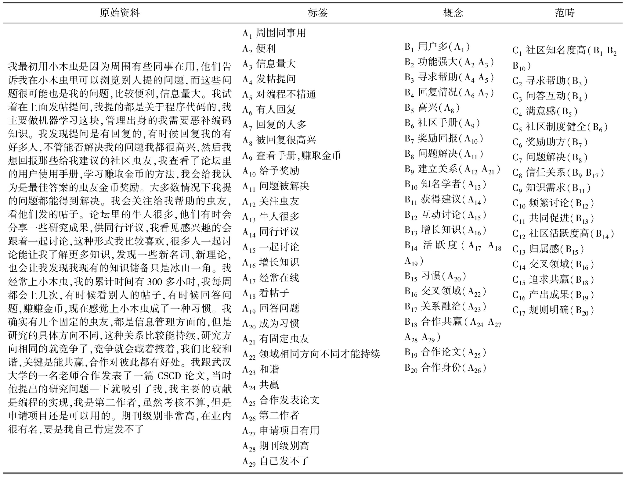 原始资料标签概念范畴我最初用小木虫是因为周围有些同事在用,他们告诉我在小木虫里可以浏览别人提的问题,而这些问题很可能也是我的问题,比较便利,信息量大。我试着在上面发帖提问,我提的都是关于程序代码的,我主要做机器学习这块,管理出身的我需要恶补编码知识。我发现提问是有回复的,有时候回复我的有好多人,不管能否解决我的问题我都很高兴,然后我想回报那些给我建议的社区虫友,我查看了论坛里的用户使用手册,学习赚取金币的方法,我会给我认为是最佳答案的虫友金币奖励。大多数情况下我提的问题都能得到解决。我会关注给我帮助的虫友,看他们发的帖子。论坛里的牛人很多,他们有时会分享一些研究成果,供同行评议,我看见感兴趣的会跟着一起讨论,这种形式我比较喜欢,很多人一起讨论能让我了解更多知识,发现一些新名词、新理论,也会让我发现我现有的知识储备只是冰山一角。我经常上小木虫,我的累计时间有300多小时,我每周都会上几次,有时候看别人的帖子,有时候回答问题,赚赚金币,现在感觉上小木虫成了一种习惯。我确实有几个固定的虫友,都是信息管理方面的,但是研究的具体方向不同,这种关系比较能持续,研究方向相同的就竞争了,竞争就会藏着掖着,我们比较和谐,关键是能共赢,合作对彼此都有好处。我跟武汉大学的一名老师合作发表了一篇CSCD论文,当时他提出的研究问题一下就吸引了我,我主要的贡献是编程的实现,我是第二作者,虽然考核不算,但是申请项目还是可以用的。期刊级别非常高,在业内很有名,要是我自己肯定发不了A1周围同事用A2便利A3信息量大A4发帖提问A5对编程不精通A6有人回复A7回复的人多A8被回复很高兴A9查看手册,赚取金币A10给予奖励A11问题被解决A12关注虫友A13牛人很多A14同行评议A15一起讨论A16增长知识A17经常在线A18看帖子A19回答问题A20成为习惯A21有固定虫友A22领域相同方向不同才能持续A23和谐A24共赢A25合作发表论文A26第二作者A27申请项目有用A28期刊级别高A29自己发不了B1用户多(A1)B2功能强大(A2 A3)B3寻求帮助(A4 A5)B4回复情况(A6 A7)B5高兴(A8)B6社区手册(A9)B7奖励回报(A10)B8问题解决(A11)B9建立关系(A12 A21)B10知名学者(A13)B11获得建议(A14)B12互动讨论(A15)B13增长知识(A16)B14活跃度(A17 A18 A19)B15习惯(A20)B16交叉领域(A22)B17关系融洽(A23)B18合作共赢(A24 A27 A28 A29)B19合作论文(A25)B20合作身份(A26)C1社区知名度高(B1 B2 B10)C2寻求帮助(B3)C3问答互动(B4)C4满意感(B5)C5社区制度健全(B6)C6奖励助方(B7)C7问题解决(B8)C8信任关系(B9 B17)C9知识需求(B11)C10频繁讨论(B12)C11共同促进(B13)C12社区活跃度高(B14)C13归属感(B15)C14交叉领域(B16)C15追求共赢(B18)C16产出成果(B19)C17规则明确(B20)