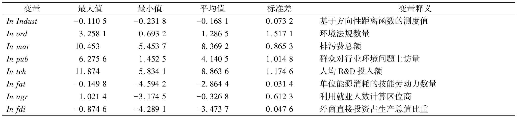 变量最大值最小值平均值标准差变量释义In Indust-0.110 5-0.231 8-0.168 10.073 2基于方向性距离函数的测度值In ord3.258 10.693 21.286 51.517 1环境法规数量In mar10.4535.453 78.369 20.865 3排污费总额In pub6.275 61.452 54.140 51.014 8群众对行业环境问题上访量In teh11.8745.834 18.863 61.174 6人均R&D投入额In fat-0.149 8-4.594 2-2.864 40.031 4单位能源消耗的技能劳动力数量In agr1.021 4-3.174 5-0.326 80.612 3利用就业人数计算区位商In fdi-0.874 6-4.289 1-3.473 70.047 6外商直接投资占生产总值比重
