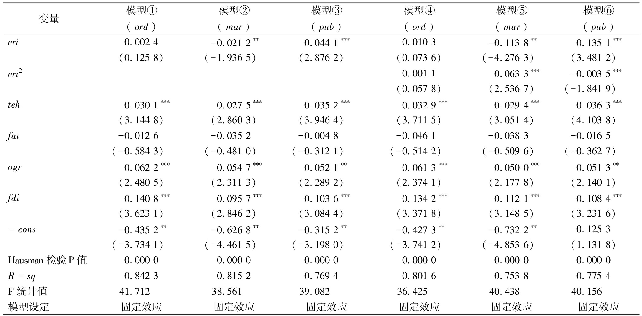 变量模型①(ord)模型②(mar)模型③(pub)模型④(ord)模型⑤(mar)模型⑥(pub)eri0.002 4-0.021 2∗∗0.044 1∗∗∗0.010 3-0.113 8∗∗0.135 1∗∗∗(0.125 8)(-1.936 5)(2.876 2)(0.073 6)(-4.276 3)(3.481 2)eri20.001 10.063 3∗∗∗-0.003 5∗∗∗(0.057 8)(2.536 7)(-1.841 9)teh0.030 1∗∗∗0.027 5∗∗∗0.035 2∗∗∗0.032 9∗∗∗0.029 4∗∗∗0.036 3∗∗∗(3.144 8)(2.860 3)(3.946 4)(3.711 5)(3.051 4)(4.103 8)fat-0.012 6-0.035 2-0.004 8-0.046 1-0.038 3-0.016 5(-0.584 3)(-0.481 0)(-0.312 1)(-0.514 2)(-0.509 6)(-0.362 7)ogr0.062 2∗∗∗0.054 7∗∗∗0.052 1∗∗0.061 3∗∗∗0.050 0∗∗∗0.051 3∗∗(2.480 5)(2.311 3)(2.289 2)(2.374 1)(2.177 8)(2.140 1)fdi0.140 8∗∗∗0.095 7∗∗∗0.103 6∗∗∗0.134 2∗∗∗0.112 1∗∗∗0.108 4∗∗∗(3.623 1)(2.846 2)(3.084 4)(3.371 8)(3.148 5)(3.231 6)-cons-0.435 2∗∗-0.626 8∗∗-0.315 2∗∗-0.427 3∗∗-0.732 2∗∗0.125 3(-3.734 1)(-4.461 5)(-3.198 0)(-3.741 2)(-4.853 6)(1.131 8)Hausman检验P值0.000 00.000 00.000 00.000 00.000 00.000 0R-sq0.842 30.815 20.769 40.801 60.753 80.775 4F统计值41.71238.56139.08236.42540.43840.156模型设定固定效应固定效应固定效应固定效应固定效应固定效应