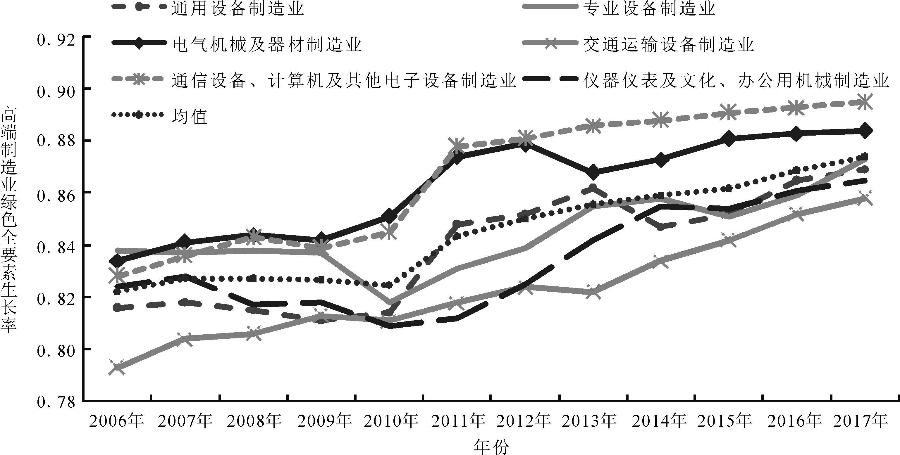 根据模型(1)和(2)测算2006—2017年高端制造业绿色全要素生产率,如图2所示。总体而言,高端制造业绿色全要素生产率均值变化由2006年的0.822 2到2017年的0.874 0,整体呈现相对稳定的递增趋势。对于其测定值应给予客观认识,一方面,高端制造业本身拥有技术、知识密集和附加值高,以及成长性好、带动性强等特点,依靠高新技术与高端装备的竞争优势赢得市场,加上近年来国家对高端制造业的重点扶持与政策激励,其良好的经济效益与持续增长能力等优势得到进一步发挥,并与传统制造业形成了鲜明对比。当然,这仅是从测度数值上理解高端制造业绿色全要素生产率维持在较高水平的重要原因;另一方面,高端制造业绿色全要素生产率的增幅变化情况更能显著刻画其发展状态。从本文测度结果看,样本区间内高端制造业绿色全要素生产率整体增长状态并未出现大幅变化,主要原因在于国内高端制造业技术创新能力与发达国家仍具有较大差距,尤其是在关键核心技术掌握上存在明显不足,同时高端制造业产业基础相对薄弱。例如,发展高端制造业不仅要瞄准生产体系的高端,推动装备制造业与战略新兴产业发展,立足本土制造业的实际基础,加快促进有色、石化、汽车、纺织等基础制造产业价值链向高端攀伸。但是在基础元器件、关键零部件等方面,国内产业面临较为严重的发展瓶颈,产业结构不平衡与产业集聚不够的状态,影响了其竞争力水平提升。因此,其数值大小与增幅变化情况说明现阶段国内高端制造业绿色全要素生产率还具备较大提升空间。观测绿色全要素生产率均值变化曲线波动,大致可划分为2006—2010年、2011—2015年和2016—2017年3个阶段。其中,样本期内首个阶段的绿色全要素生产率均值变动趋势是相对平缓的先增后降,主要原因可能在于“十一五”期间政府提升环境纳污治理力度,不仅提出降低排污总量10%的硬性目标要求,而且将煤炭资源开发、能源项目环境管理等作为重点考核对象,短期内提升环境规制强度取得了一定成效,但处于政策消化调整期的高端制造业发展也受到了相应的影响,再加上2008年金融危机的影响,高端制造业绿色全要素生产率出现短期下滑。第二阶段绿色全要素生产率均值变动恰好处于“十二五”期间,该阶段以《高端装备制造业“十二五”发展规划》、《“十二五”主要污染物总量控制规划》等为牵引的引导性政策相继颁布,从金融财税、技术创新、产业组织结构等方面对高端制造业绿色集约化发展给予强有力的支持,促使高端制造业在强化环境治理上取得成效。2016年,高端制造业绿色全要素生产率均值增速再次提档,尤其是在《中国制造2025》、《工业绿色发展规划(2016—2020年)》导向下,高端制造业绿色化转型升级速率明显加快,排污总量持续下降,资源循环利用水平稳定上升。